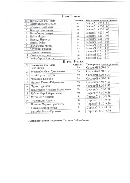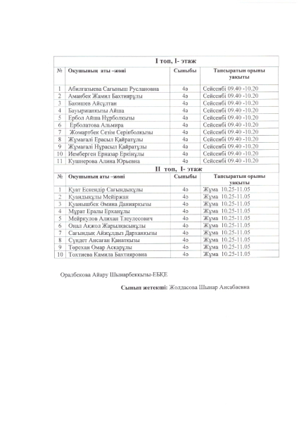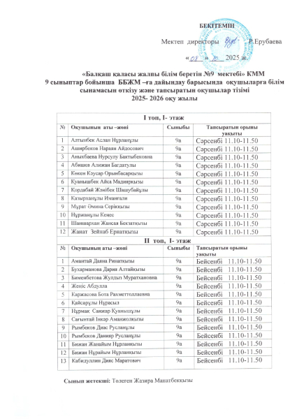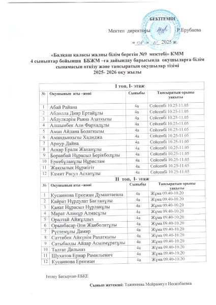 "Балқаш қаласы жалпы білім беретін №9 мектебі" КММ 4сыныптар бойынша ББЖМ-ға дайындау барысында оқушыларға білім сынамасын өткізу және тапсыратын оқушылар тізімі 2025-2026 оқу жылы