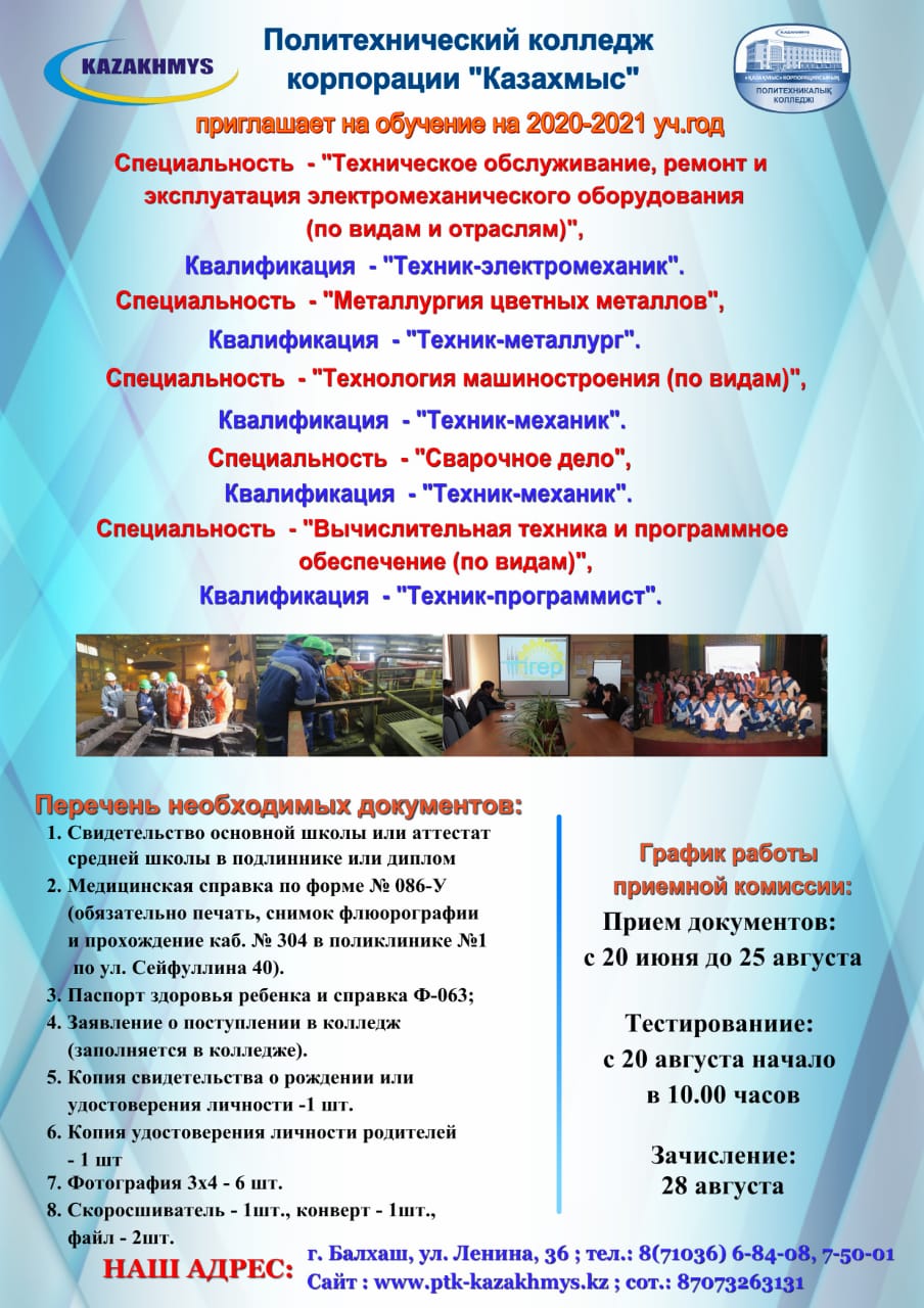 Политехнический колледж корпорации "Казахмыс" приглашает на обучение на 2020-2021 учебный год