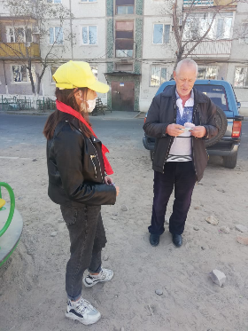 3 мобильные группы в составе заместителей директора по ВР Кириченко Л.В., Ливицкой М.А., представителя родительской общественности Давыденко Н.С. и учащихся из 5-11 классов (12 чел.) провели раздачу флаеров жителям города, которые ходят без масок. Акция проведена в районе улиц Бокейханова, Желтоксан, Алимжанова, переулка Калмыкова.