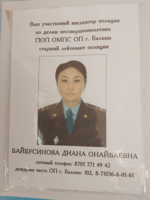 "Балқаш қаласының №10 ЖББОМ" КММ мектеп инспекторы Байбусинова Д. О. бекітілді.. Осы байланыс нөмірлері бойынша сізді қызықтыратын сұрақтар бойынша және жеке кеңестер алу үшін хабарласуға болады.