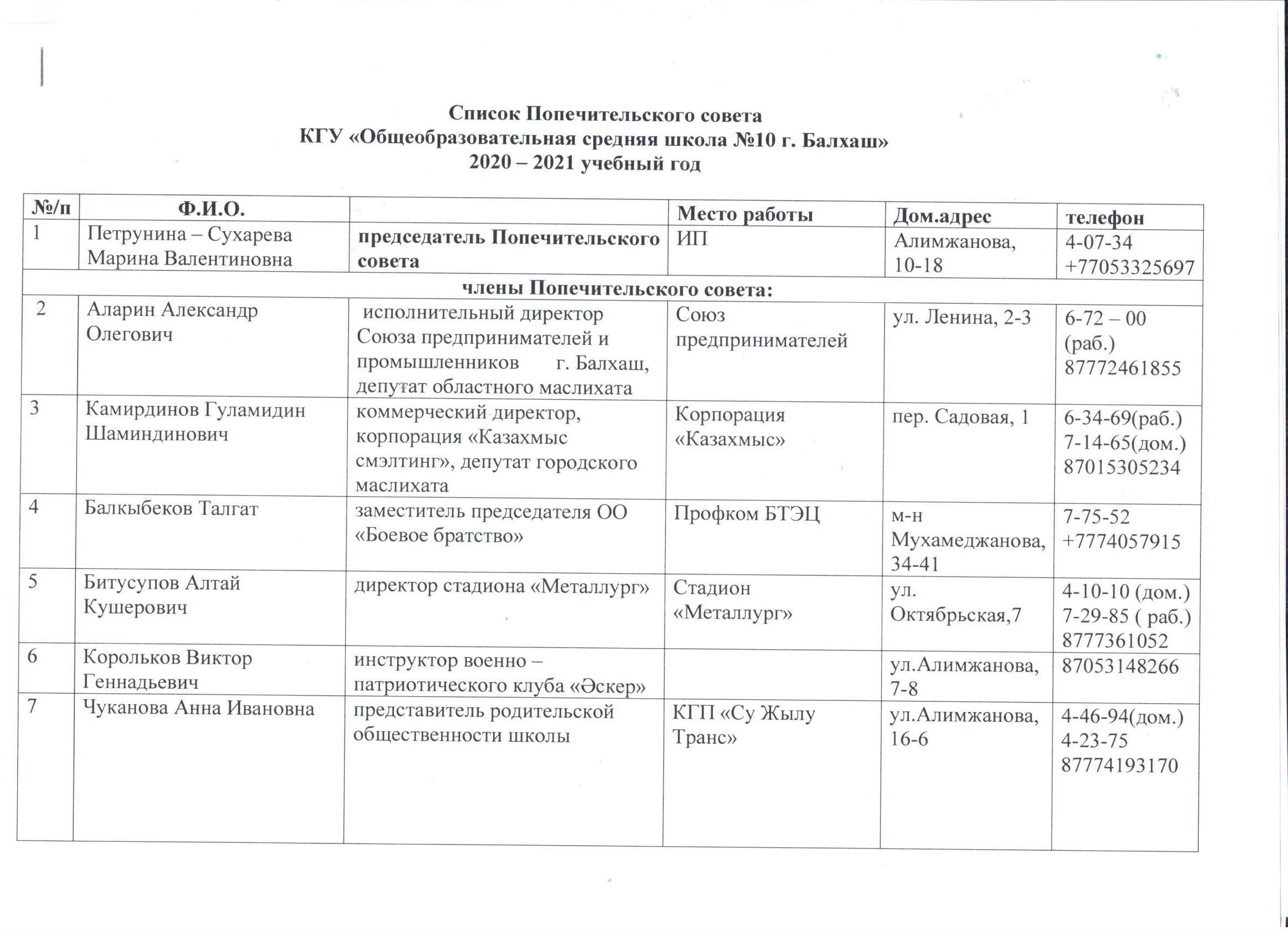 Балқаш қаласының №10 жалпы білім беретін мектебі "КММ Қамқоршылық кеңесінің тізімі 2020-2021 оқу жылы.