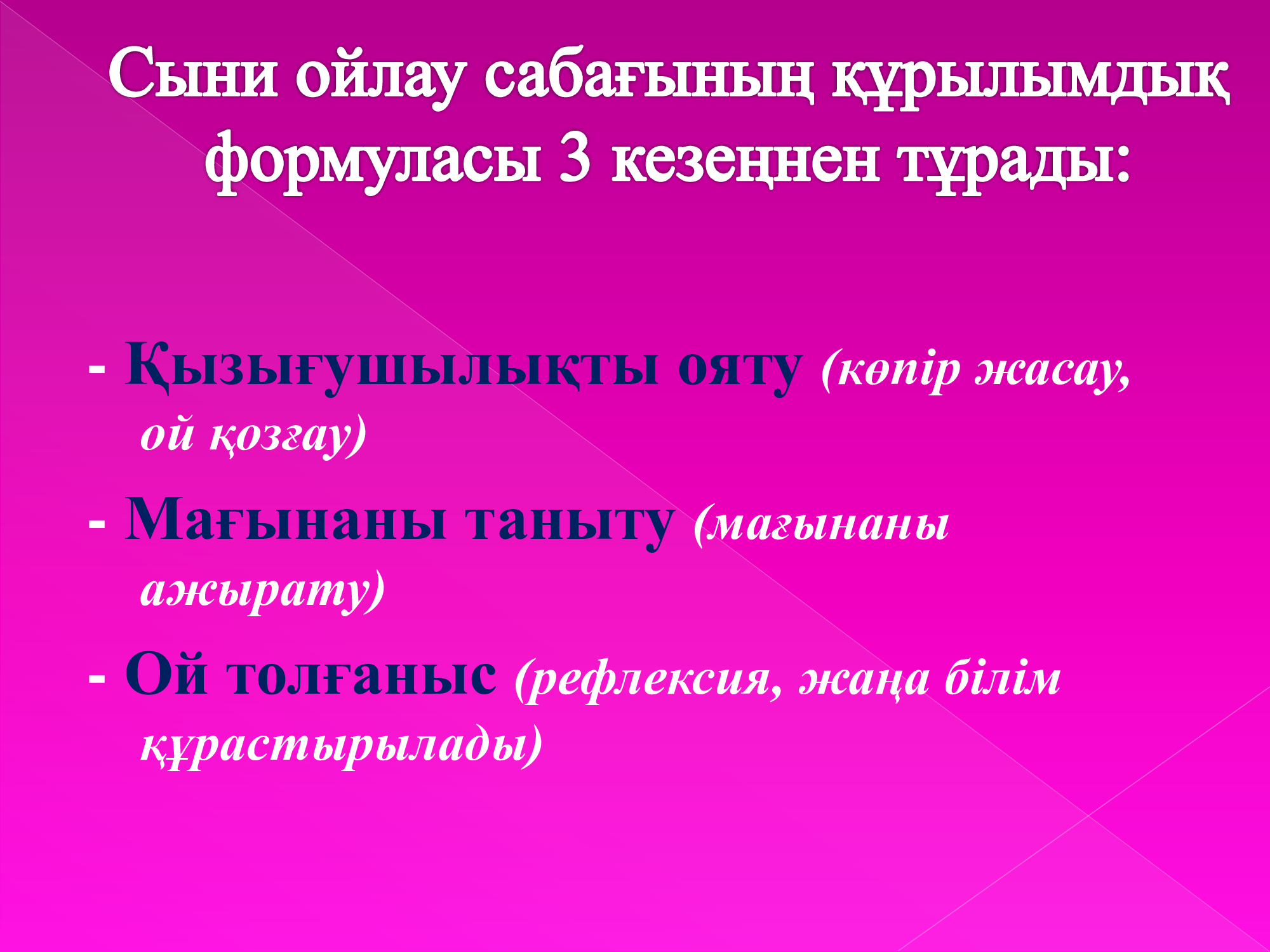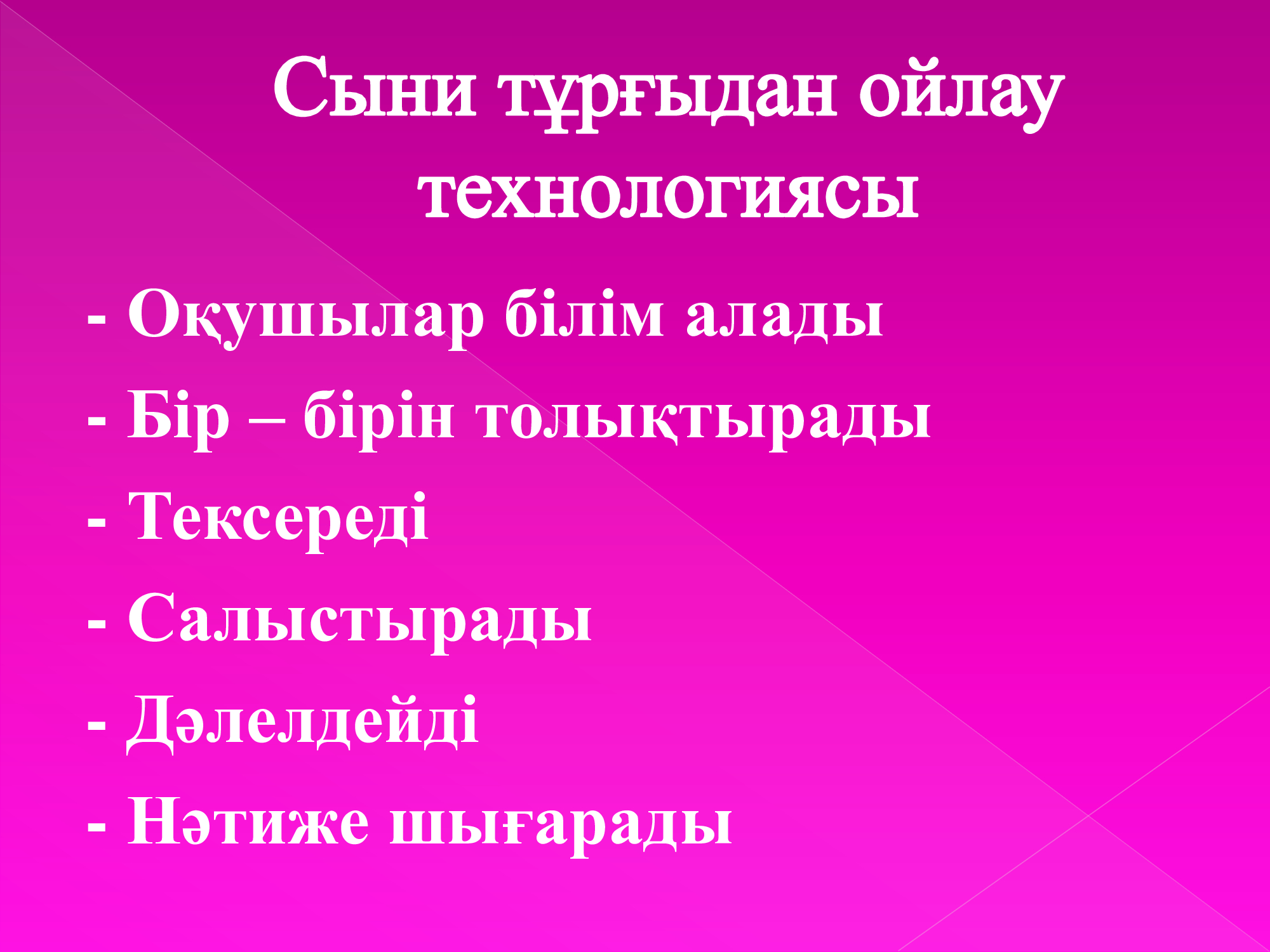 На мастер-классе для учителей «эффективное использование стратегии критического мышления на уроке» было рассказано о структурных формулах урока критического мышления, об особенностях, основных алгоритмах традиционного урока и урока критического мышления. Мастер-учитель казахского языка и литературы Карипжанова С. К. рассказала о том, как она использует в своей практике, поделилась различными стратегиями.
