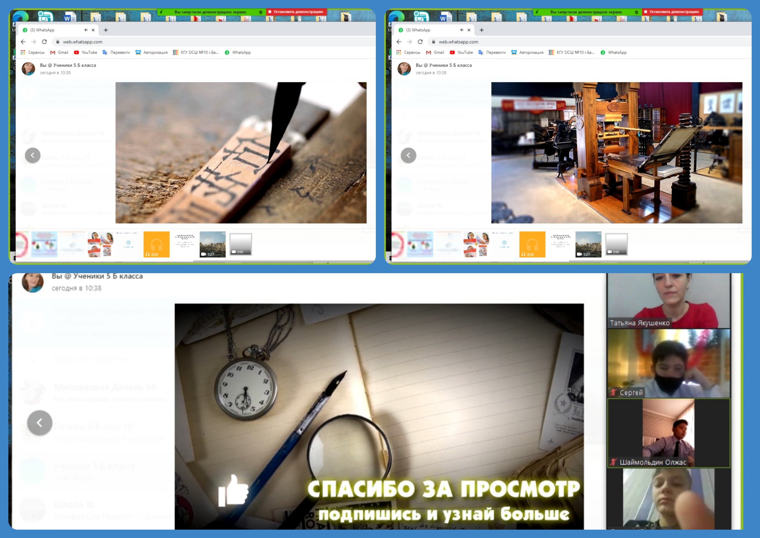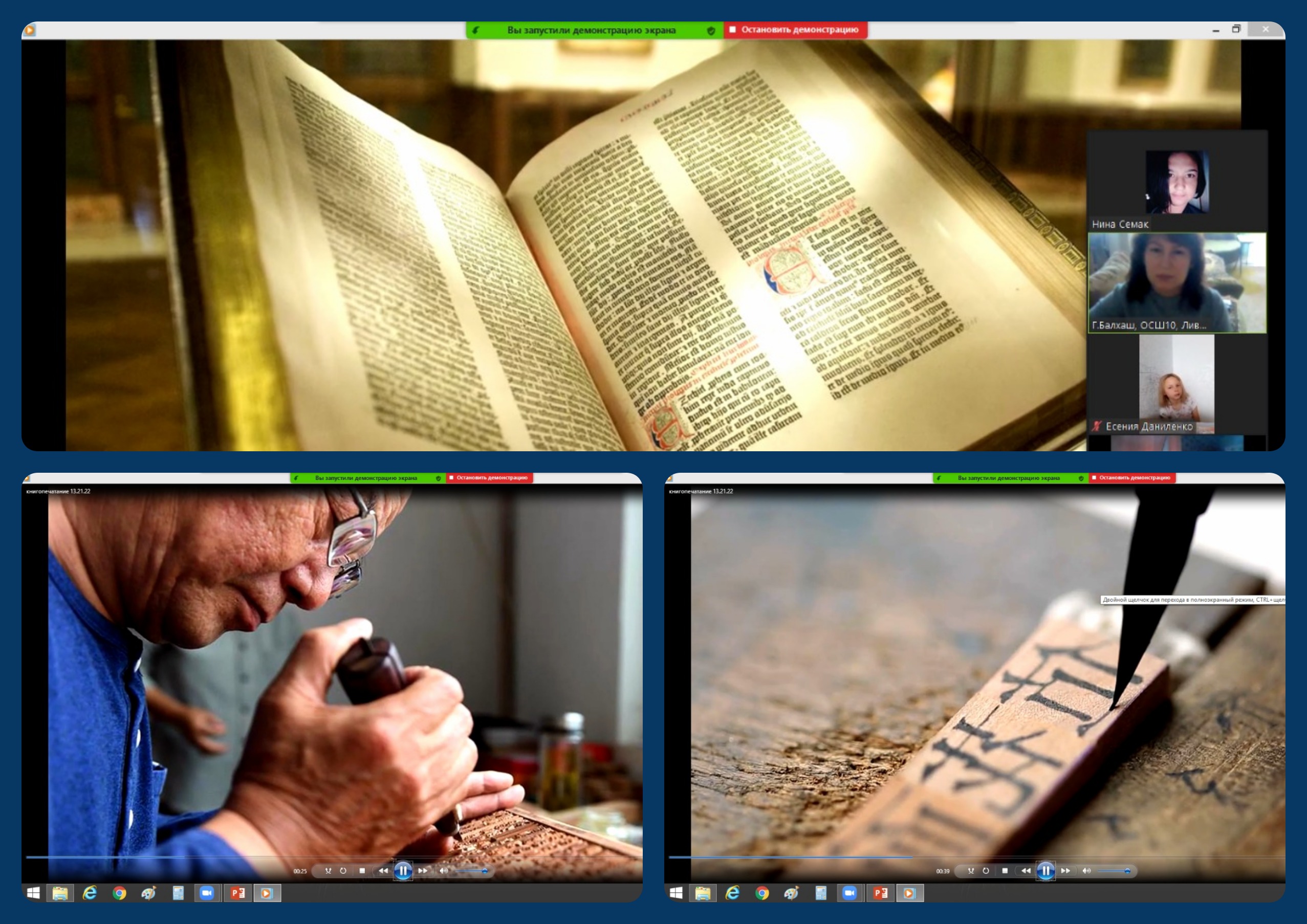 Жас ерекшеліктеріне сай сараптап алынған видео материалдарды тамашалаған оқушылар қағаз жасау өнері Шығыстан Батысқа қарай тарағанын, баспа кітап өнерінің тууы-кітаптың дамуына кең жол ашқанын, алғашқы ағаш баспа қалыбы ХІ ғасырда пайда болғанын,1045 жылы Чин өнерпазы Би-Шен құймалы әріптерді жасап шығарғанын,