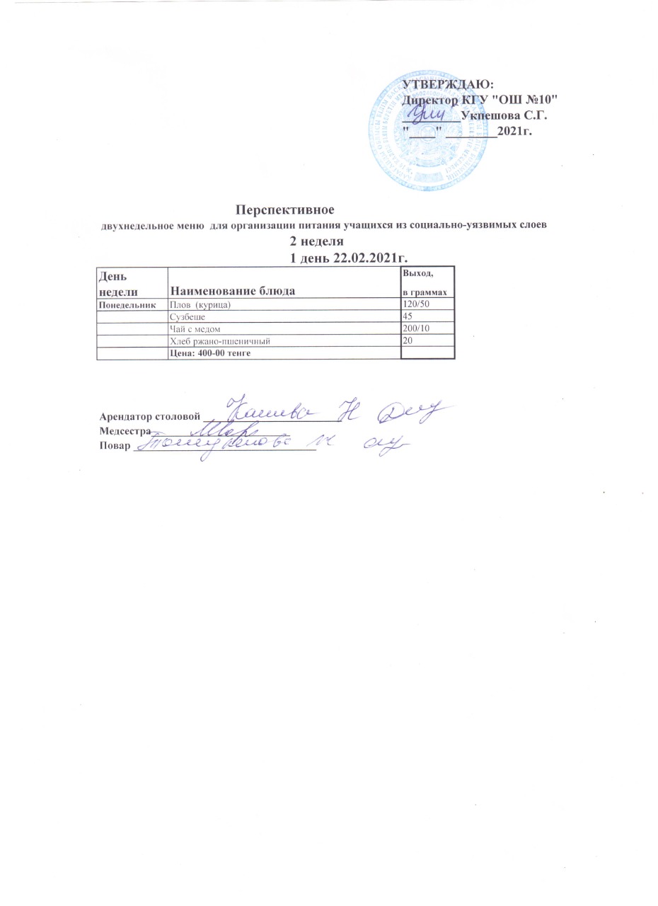 Халықтың әлеуметтік осал топтарынан шыққан оқушыларды тамақтандыруды ұйымдастыруға арналған перспективалы екі апталық мәзір II апта 1 күн 22.02.2021.
