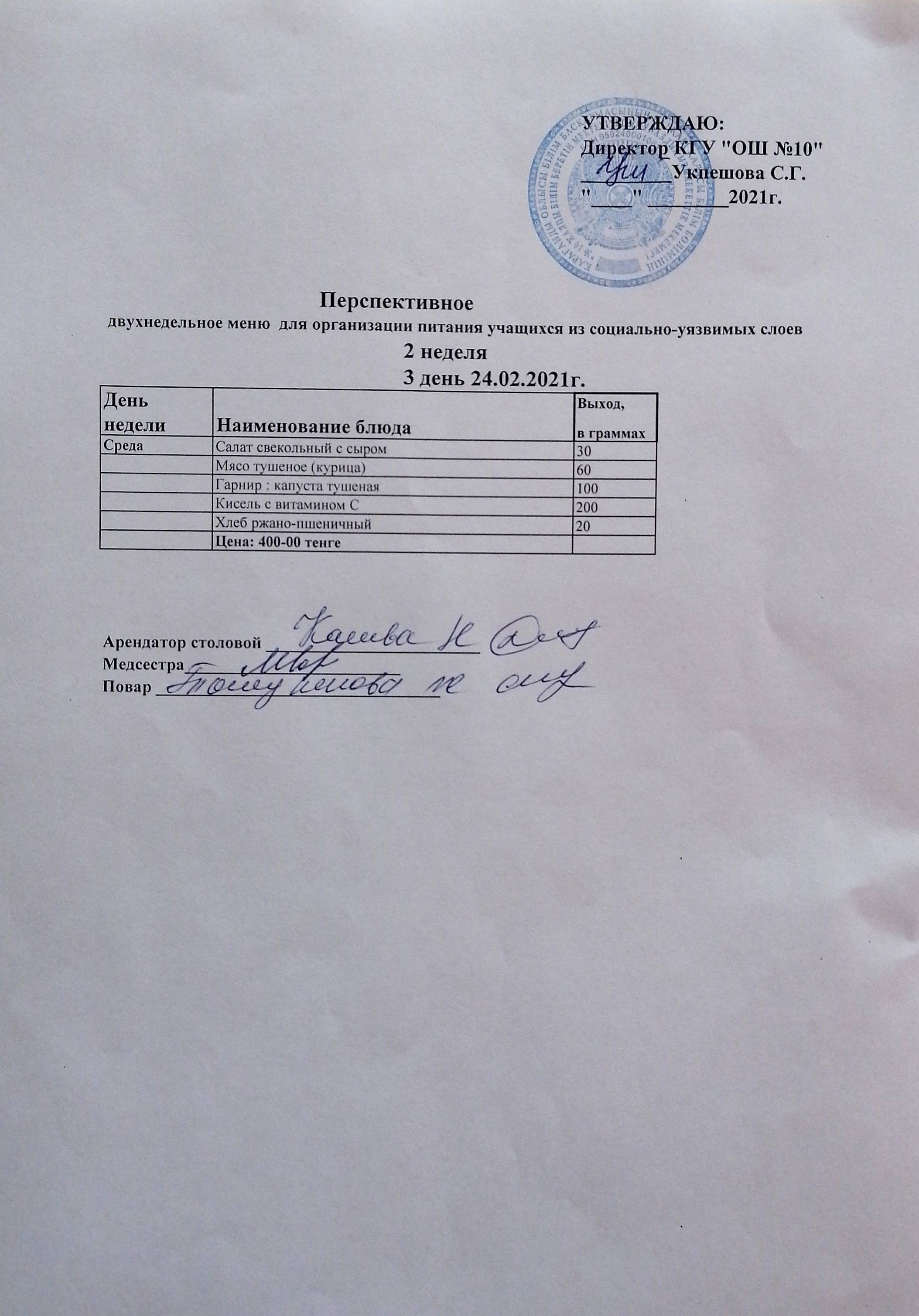 Халықтың әлеуметтік осал топтарынан шыққан оқушыларды тамақтандыруды ұйымдастыруға арналған перспективалы екі апталық мәзір II апта 3 күн 24.02.2021