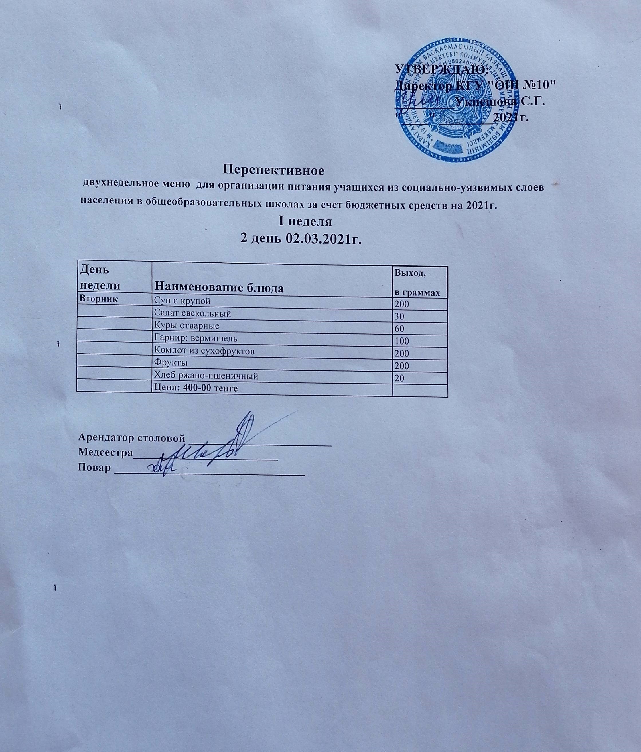 Халықтың әлеуметтік осал топтарынан шыққан оқушыларды тамақтандыруды ұйымдастыруға арналған перспективалы екі апталық мәзір I апта 2 күн 02.03.2021