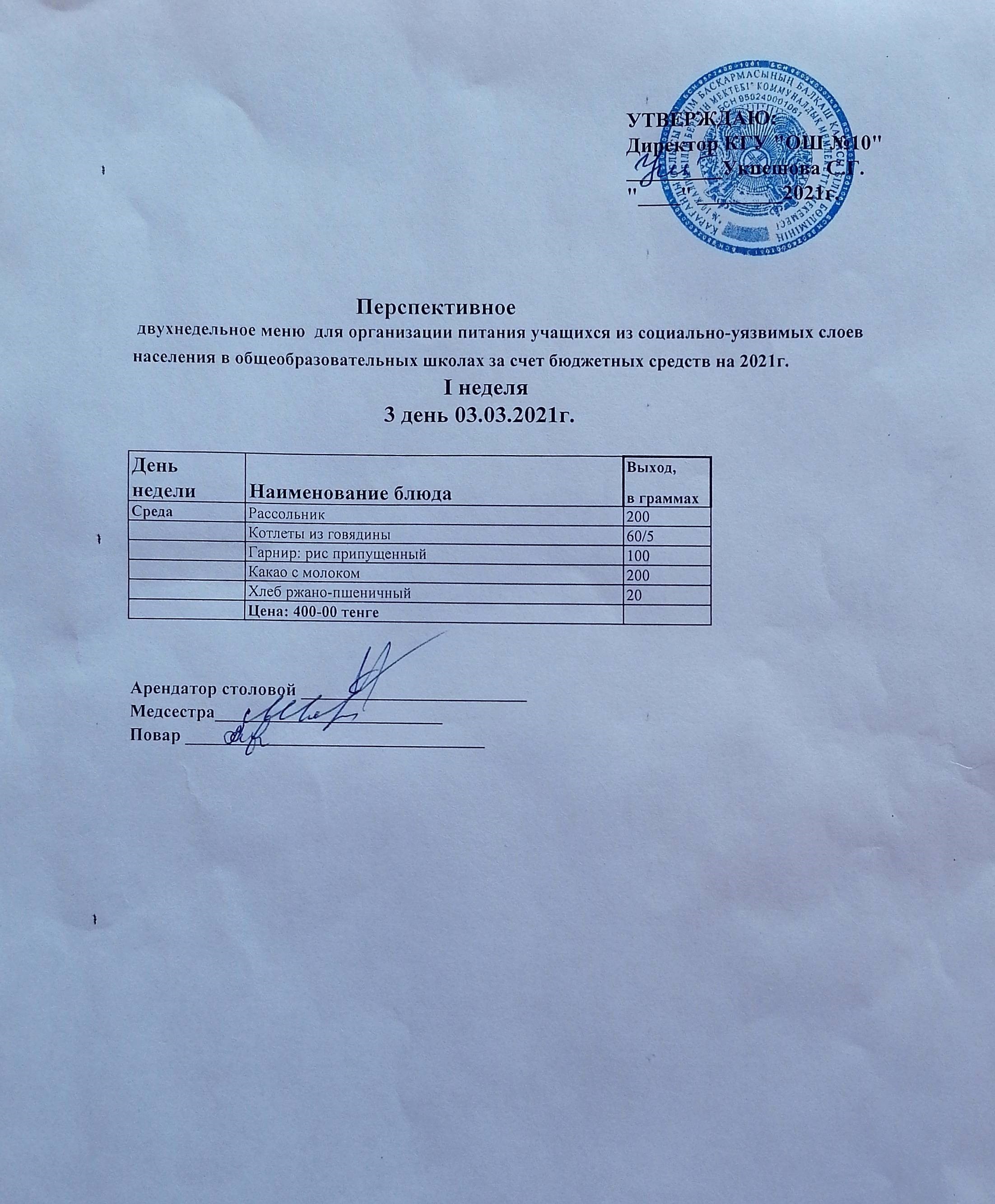 Перспективное двухнедельное меню для организации питания учащихся из социально-уязвимых слоёв населения I неделя 3 день 03.03.2021