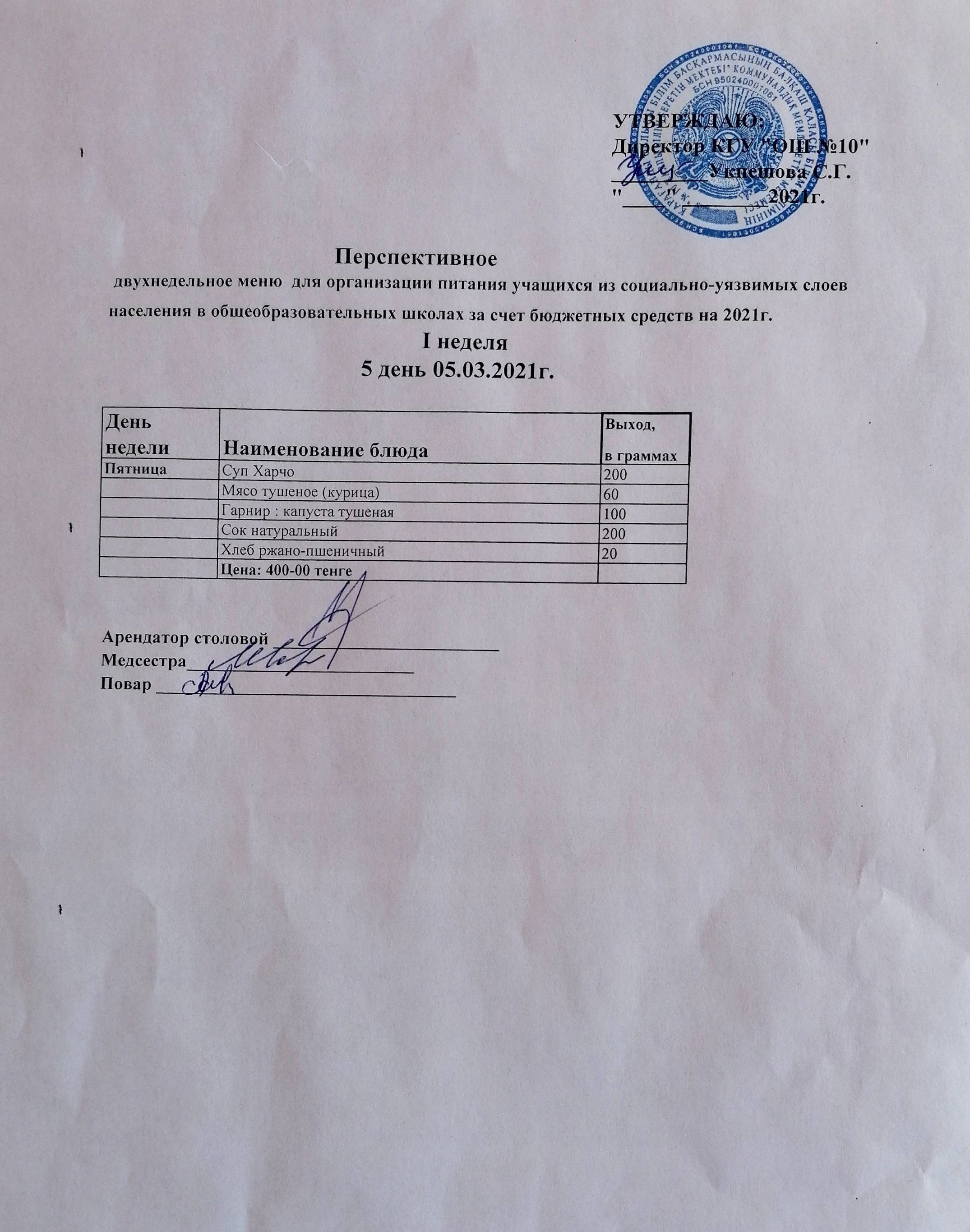 Перспективное двухнедельное меню для организации питания учащихся из социально-уязвимых слоёв населения I неделя 5 день 05.03.2021