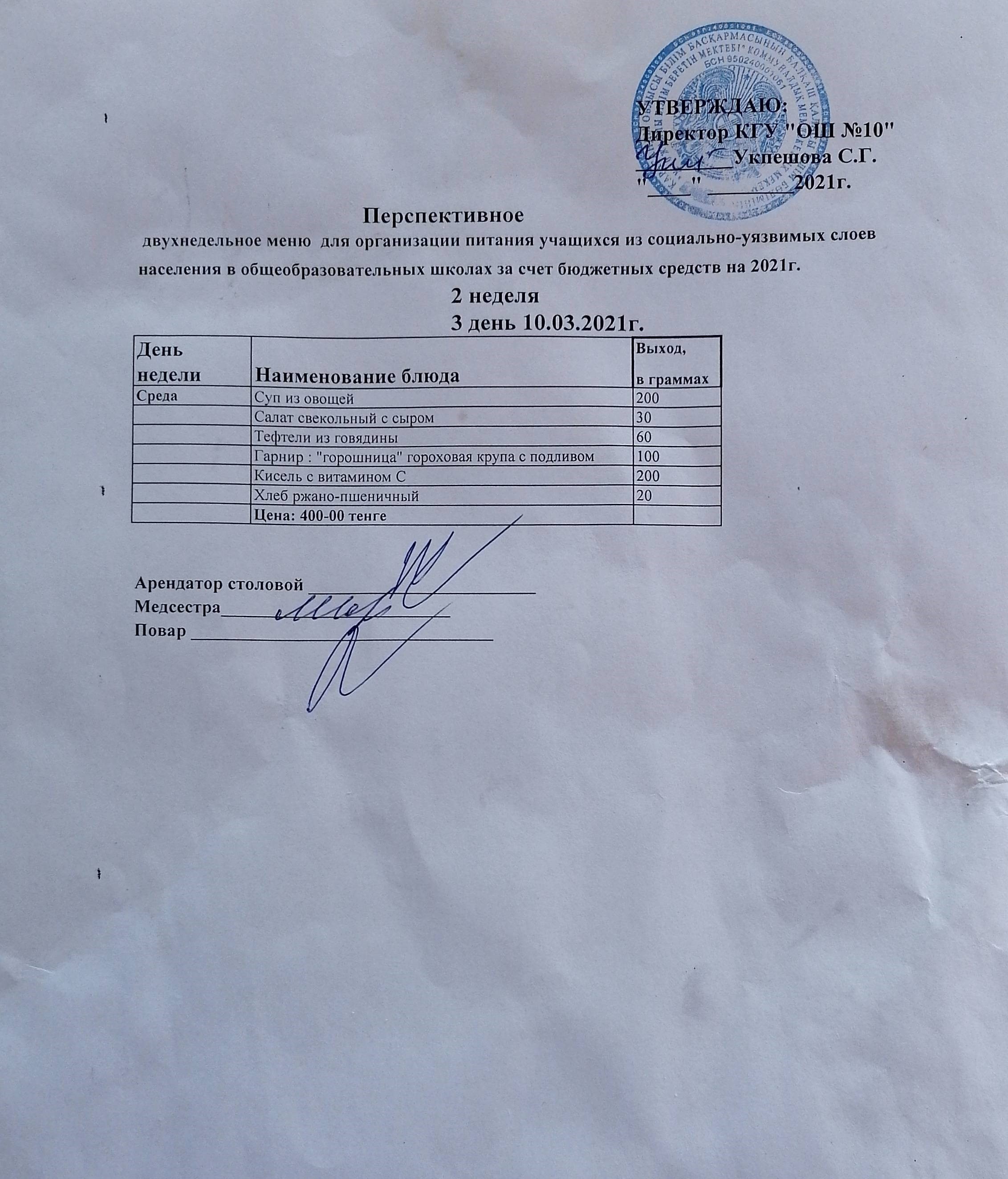 Халықтың әлеуметтік осал топтарынан шыққан оқушыларды тамақтандыруды ұйымдастыруға арналған перспективалы екі апталық мәзір II апта 3 күн 10.03.2021