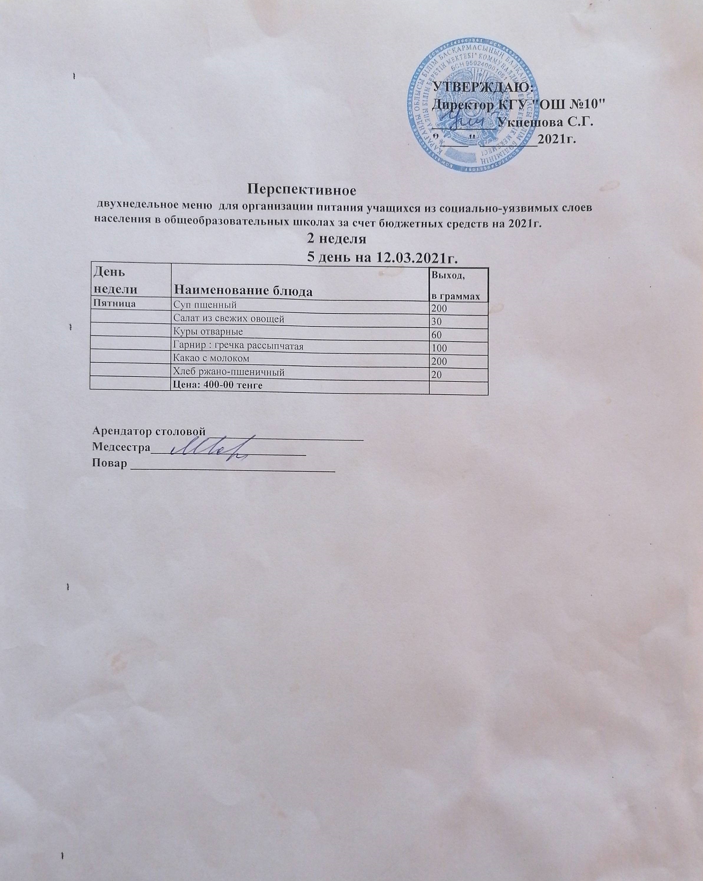 Халықтың әлеуметтік осал топтарынан шыққан оқушыларды тамақтандыруды ұйымдастыруға арналған перспективалы екі апталық мәзір II апта 5 күн 12.03.2021