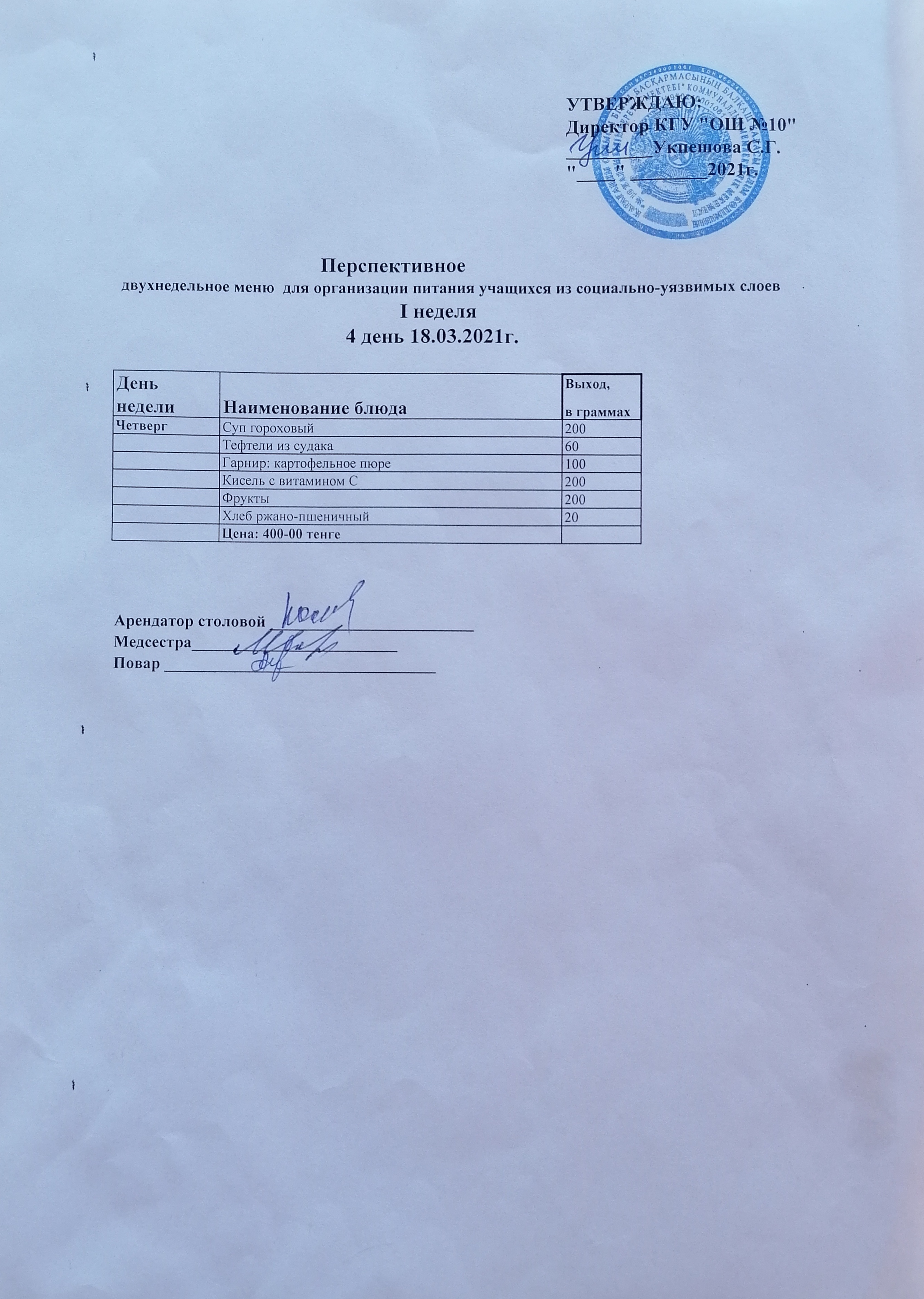 Халықтың әлеуметтік осал топтарынан шыққан оқушыларды тамақтандыруды ұйымдастыруға арналған перспективалы екі апталық мәзір I апта 4 күн 18.03.2021