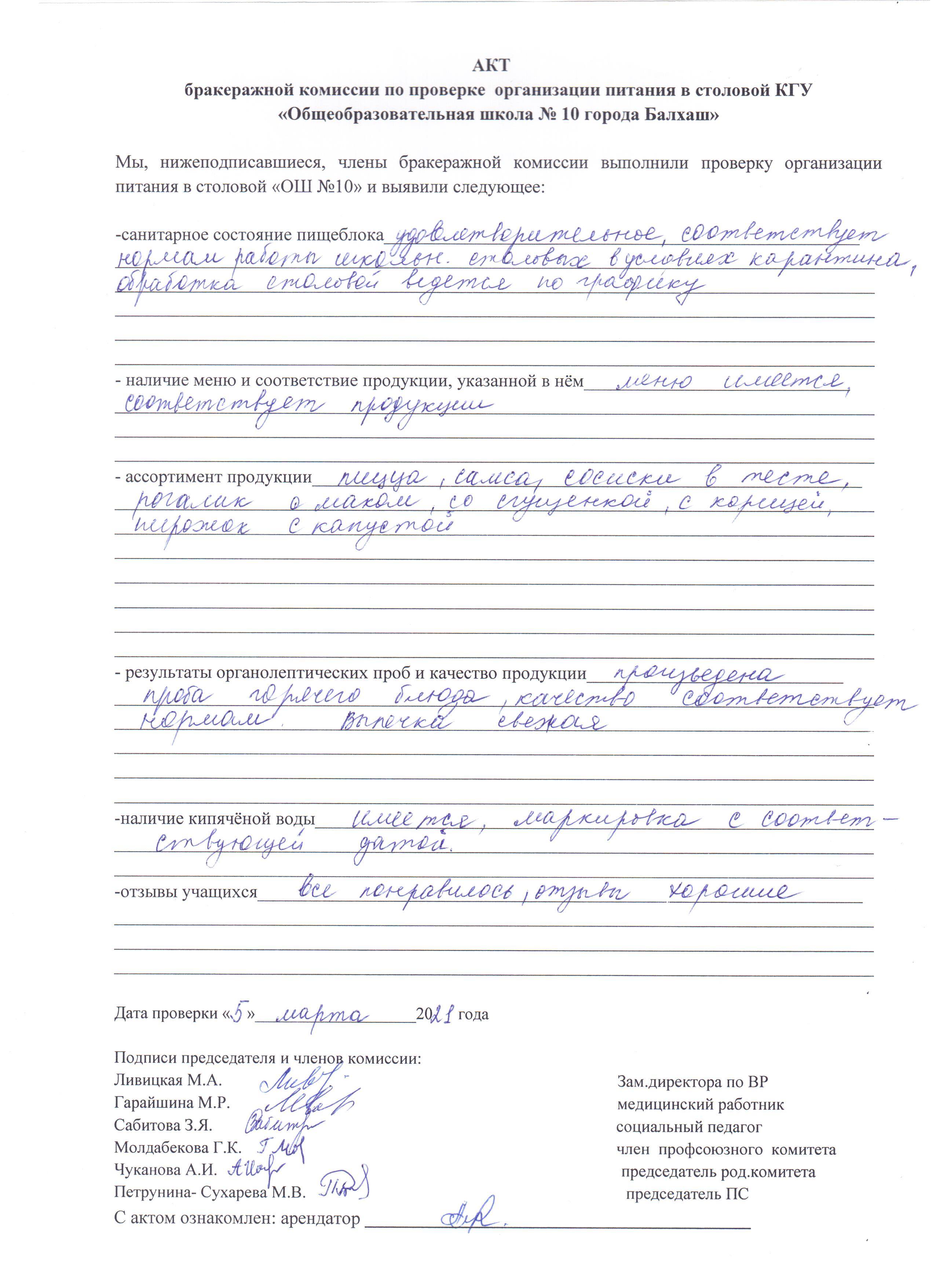 «Балқаш қаласының №10 жалпы білім беретін мектебі» КММ асханасында тамақтануды ұйымдастыруды тексеру жөніндегі бракераж комиссиясының актісі 5 наурыз