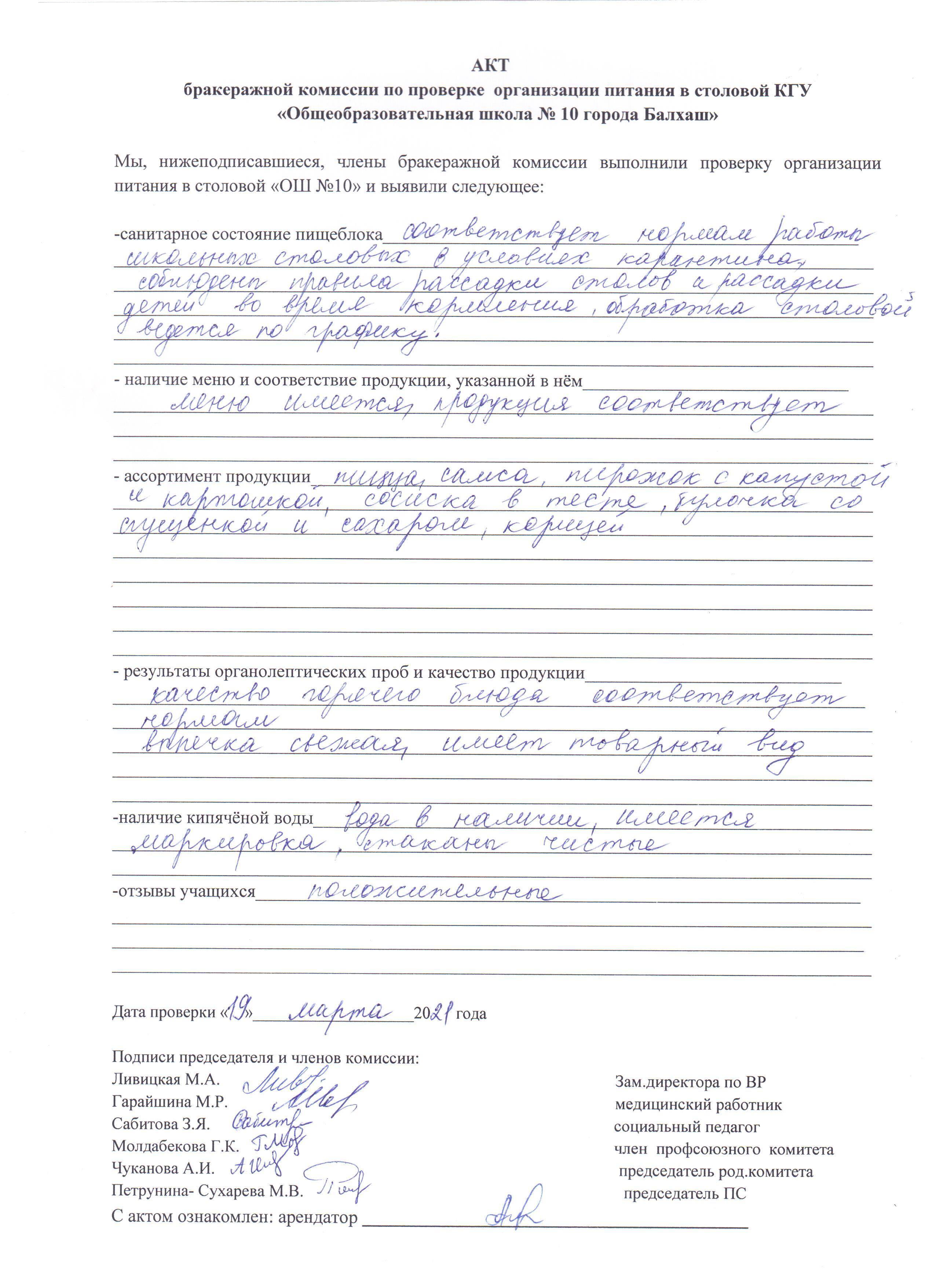 «Балқаш қаласының №10 жалпы білім беретін мектебі» КММ асханасында тамақтануды ұйымдастыруды тексеру жөніндегі бракераж комиссиясының актісі 19 наурыз