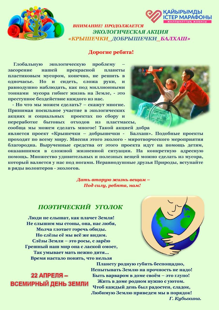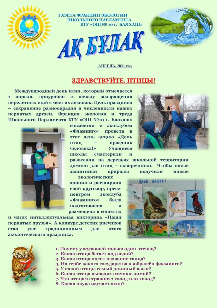 Балқаш қ. № 10 ЖББМ " КММ экологиялық сауаттылық апталығының төртінші күні мектеп Парламентінің таңғы поштасын шолудан басталды. Оқушылар мен педагогтардың назарына " Ақ бұлақ "экологиялық газетінің жаңа шығарылымы ұсынылды. Осы мерзімді мектеп басылымының сәуір айындағы жазбалары қысқа, айқын безендірілген, өзекті және танымдық ақпарат берді. Газет беттерінде бүгін, 22 сәуірде атап өтілетін Дүниежүзілік Жер күніне арналған "Ақындық бұрыш" үшін орын табылды.