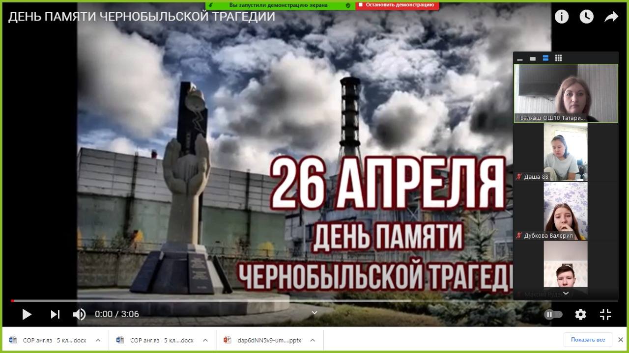 "Балқаш қаласының № 10 ЖББМ" КММ мектеп парламентінің баспасөз орталығы (Экология және еңбек фракциясы) қарым-қатынас сағаттарында көрсету үшін "Чернобыль трагедиясын еске алу күні"шағын бейнесюжет құрды.