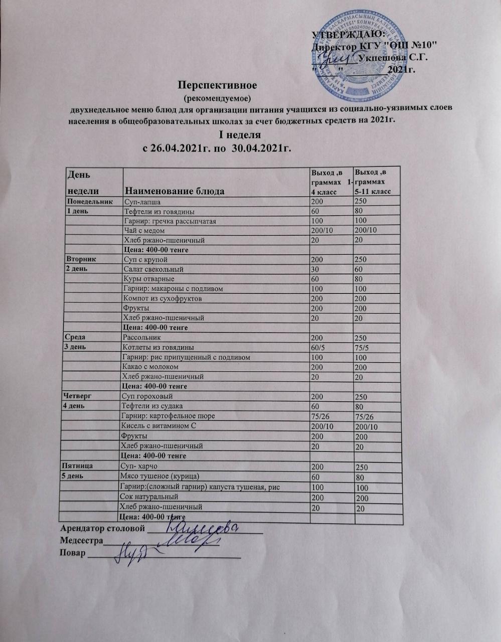 Перспективное (рекомендуемое) двухнедельное меню блюд для организации питания учащихся из социально-уязвимых слоев населения в общеобразовательных школах за счет бюджетных средств на 2021г. I неделя с 26.04.2021г. по 30.04.2021г.