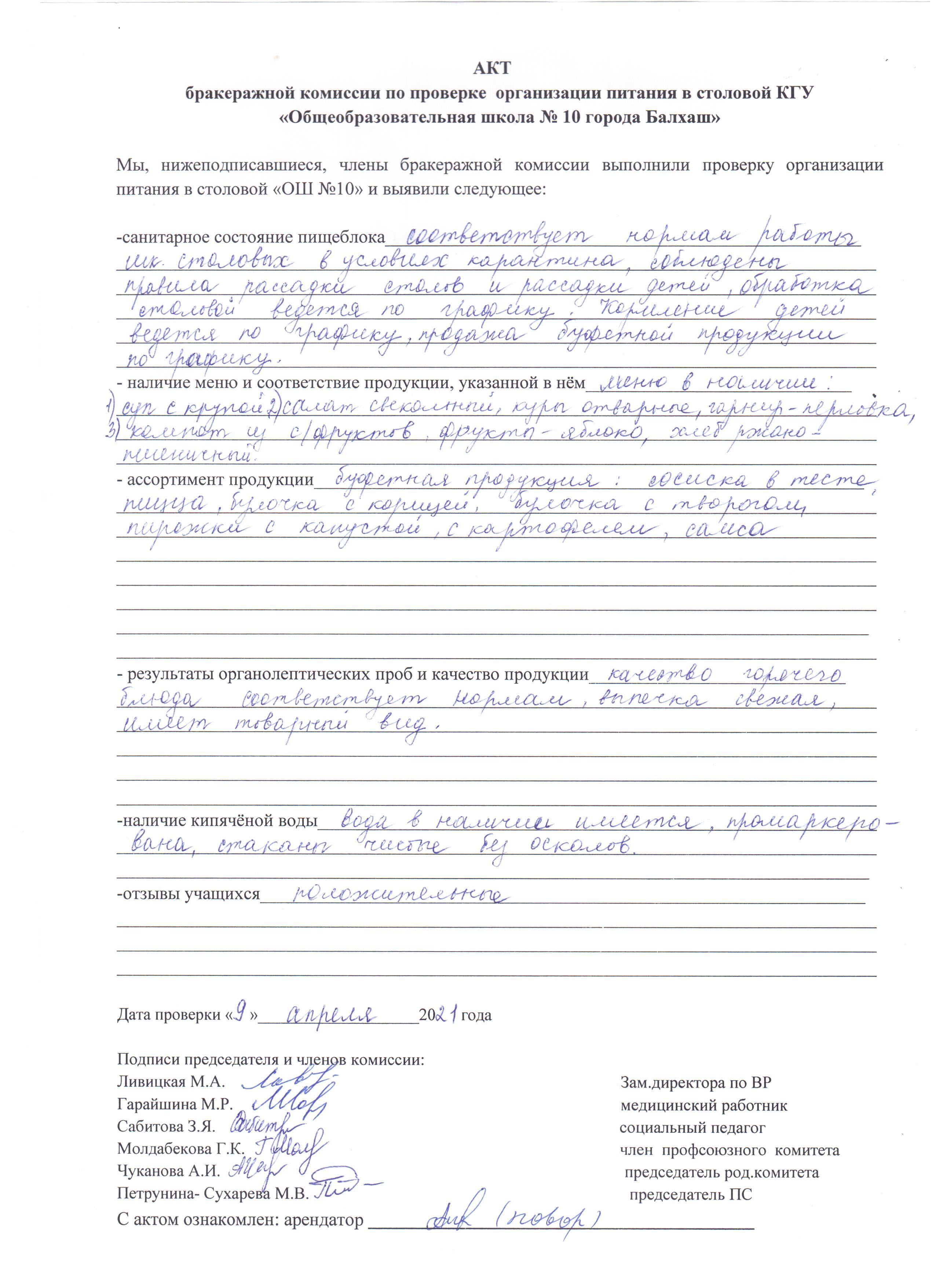 «Балқаш қаласының №10 жалпы білім беретін мектебі» КММ асханасында тамақтануды ұйымдастыруды тексеру жөніндегі бракераж комиссиясының актісі 9 сәуір