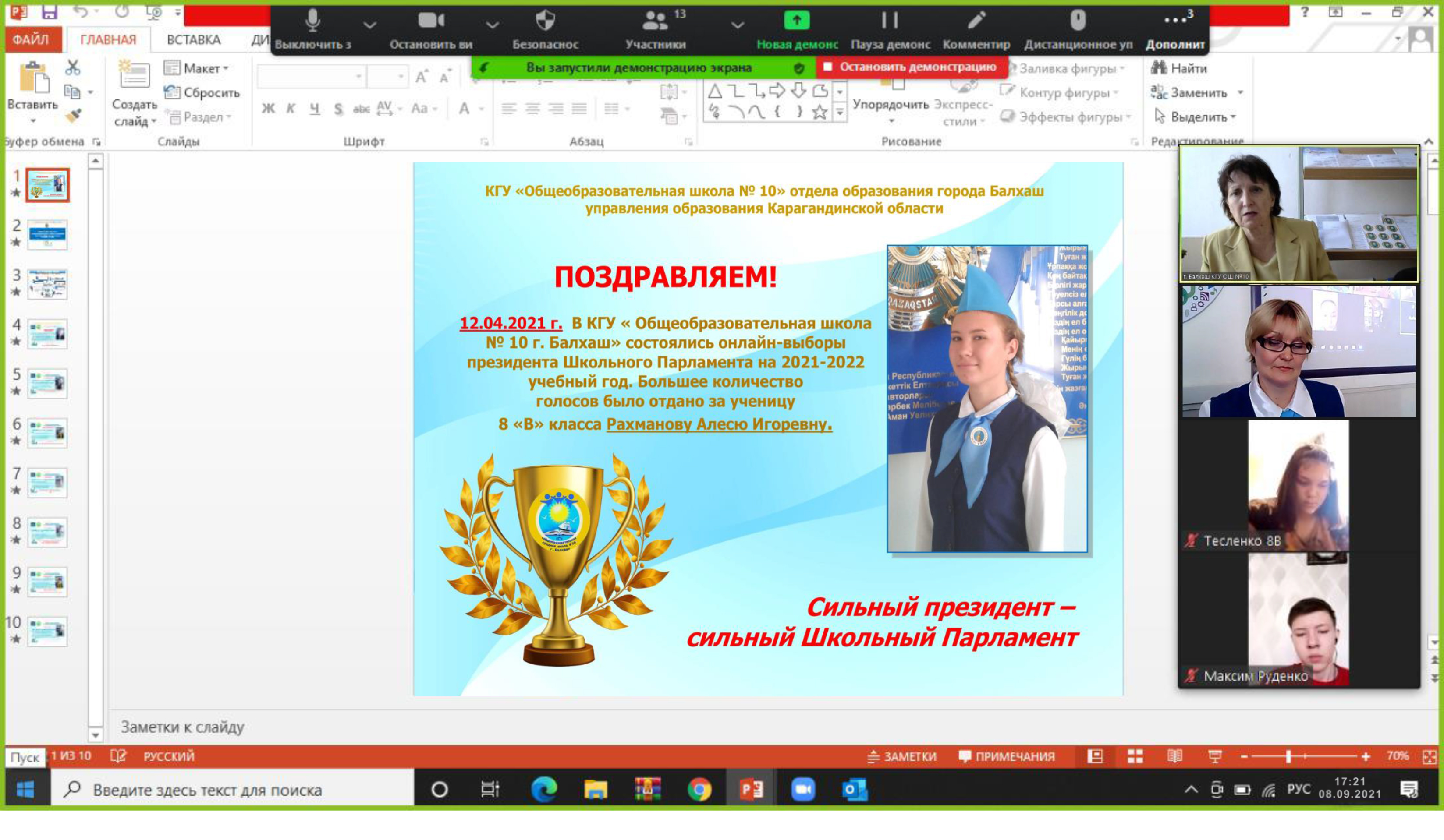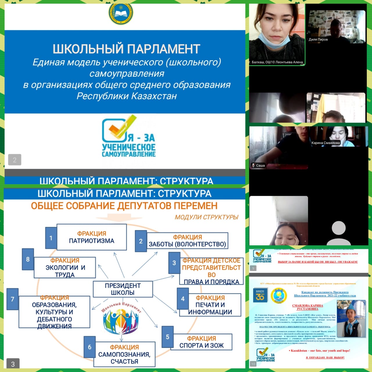 Балқаш қаласының білім бөлімінің "№ 10 жалпы білім беретін мектеп" КММ қыркүйек айының алғашқы күндерінен бастап мектеп Парламентінің белсенді жұмысы басталды. Оқушылардың өзін-өзі басқару Президентін сайлау және фракция жетекшілерін тағайындау өткен оқу жылының сәуір айында өтті. Сайлау ұраны: "мықты президент - мықты мектеп Парламенті". Сыныптарда мектеп парламентінің президенті лауазымына үміткерді ұсыну үшін сайлау блоктары құрылды. Оқушылар өз шешімдерін сынып активтерінің онлайн - отырыстарында қабылдады. Сынып чаттарына онлайн - сайлау ережелері және мектеп Парламентінің президенттігіне үміткерлердің сайлау алдындағы бағдарламалары бар презентация жіберілді. 13.04.21 ж.онлайн-сайлауға 7-11 сыныптардың 202 оқушысы (93%) және 30 мұғалім қатысты. 9 "В" сынып оқушысы Алеся Рахмановаға көп дауыс берілді.