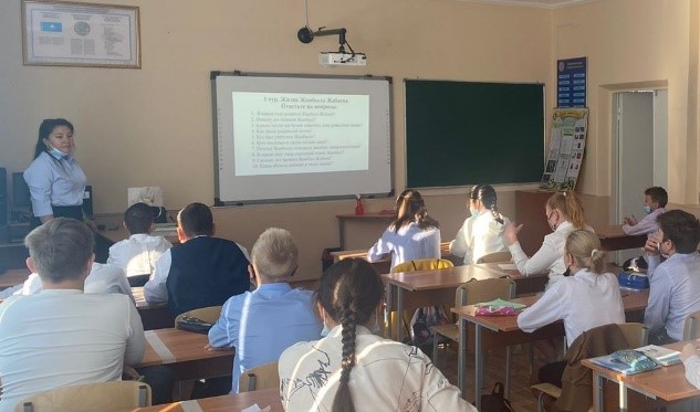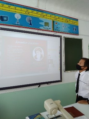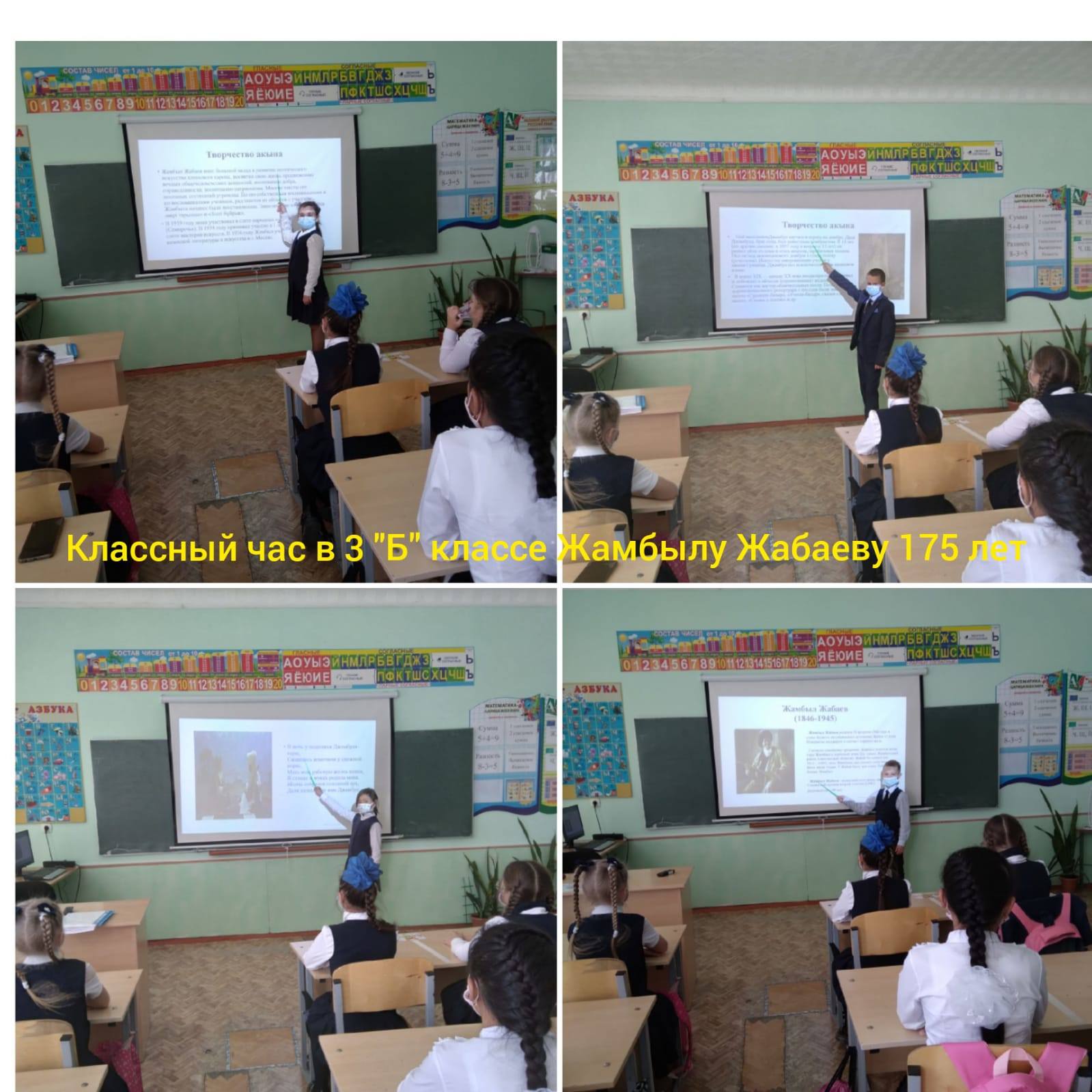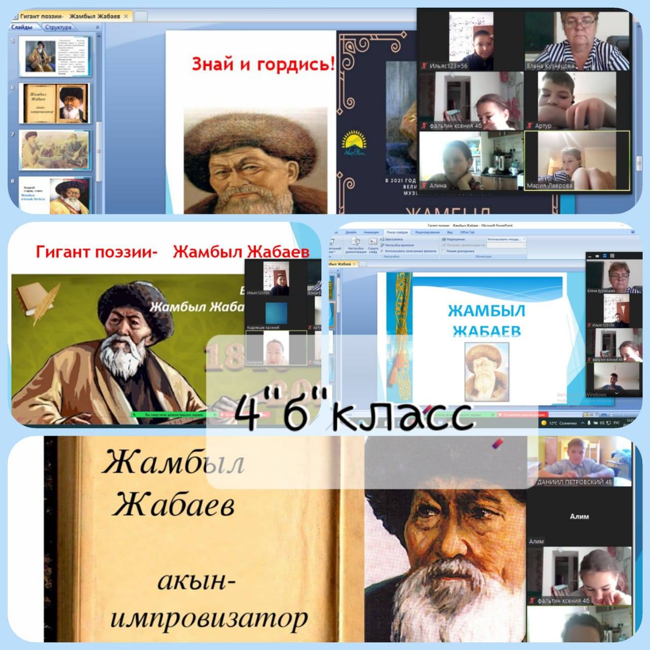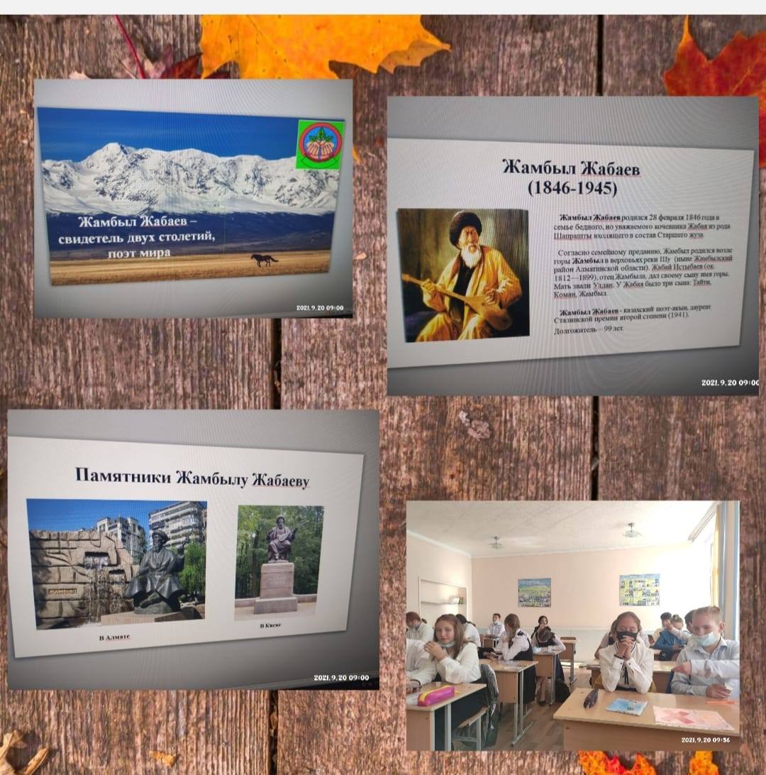 Сегодня его творчество обрело особую актуальность для духовного обновления общества. Жамбыл стал не только гордостью казахского народа, но и вершиной поэзии мирового уровня. В 7- 11 классах КГУ «ОШ №10 г. Балхаш» проведены классные часы по темам: «Великий казахский поэт Жамбыл Жабаев» ( 7,8 кл.), «Творчество Ж.Жабаева в зеркале истории» (9-11кл.). При проведении классного часа были использованы исторические документы, презентации о жизни и деятельности Ж.Жабаева. Звучали стихи поэта, в исполнении учащихся.