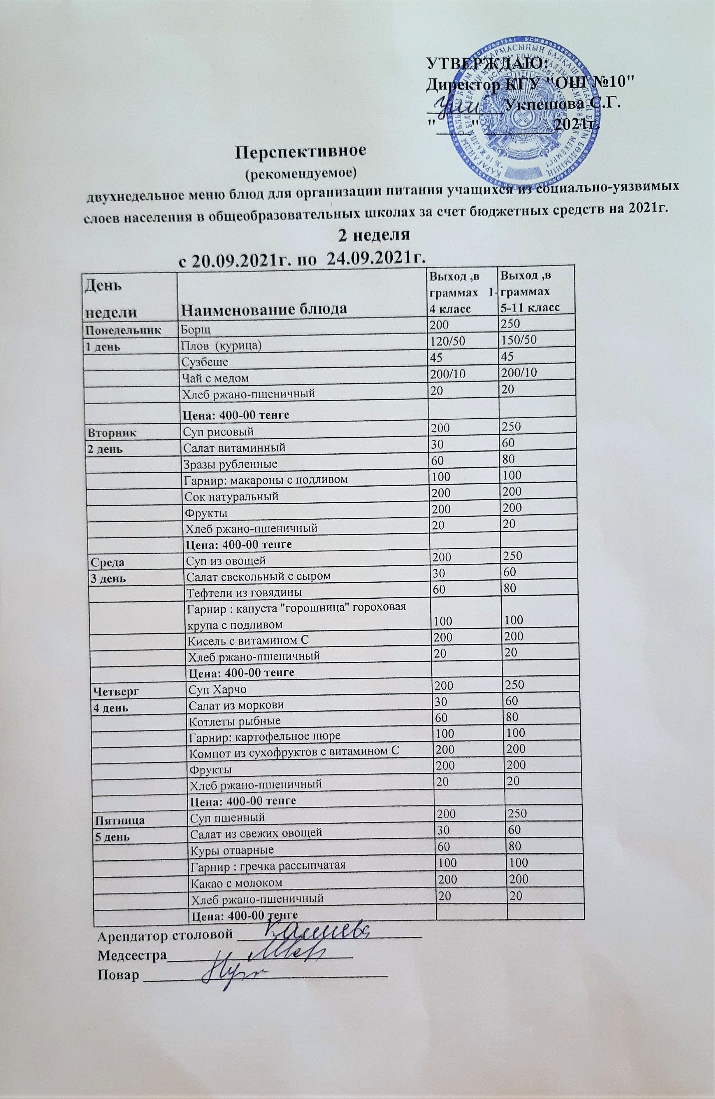 Перспективное (рекомендуемое) двухнедельное меню блюд для организации питания учащихся из социально-уязвимых слоев населения в общеобразовательных школах за счет бюджетных средств на 2021 год 2 неделя с 20.09.2021 по 24.09.2021 (4 день)