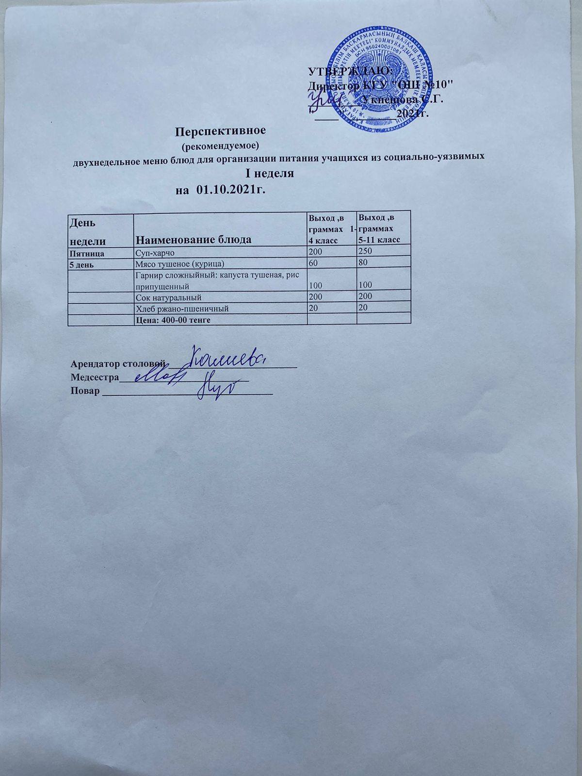Перспективное (рекомендуемое) двухнедельное меню блюд для организации питания учащихся из социально-уязвимых слоев населения в общеобразовательных школах за счет бюджетных средств на 2021 год 1 неделя 01.10.2021 (5 день)