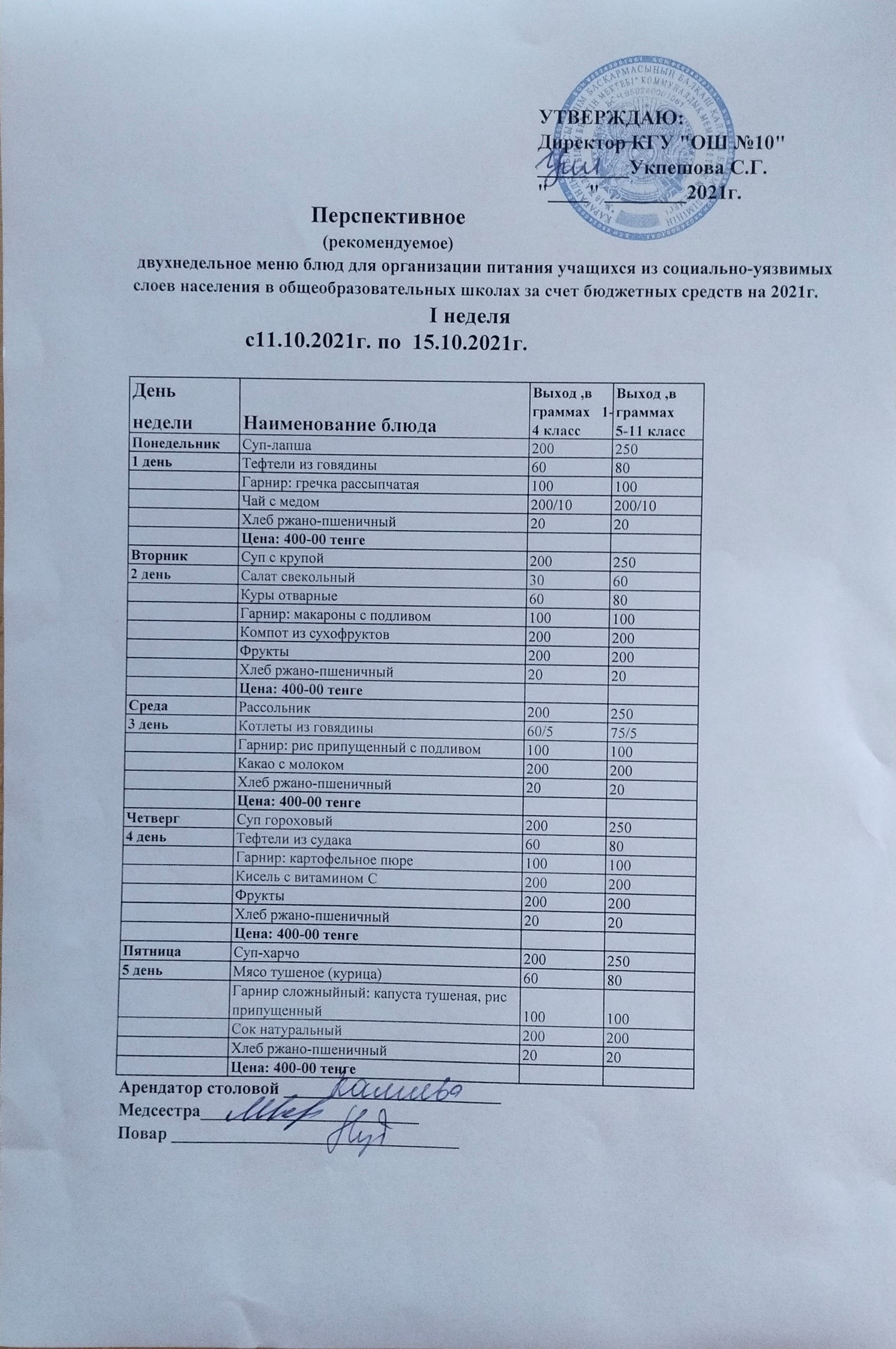 A promising (recommended) two-week menu of dishes for organizing meals for students from socially vulnerable segments of the population in secondary schools at the expense of budget funds for 2021 1 week from 10/11/2021 to 10/15/2021 (4 days)