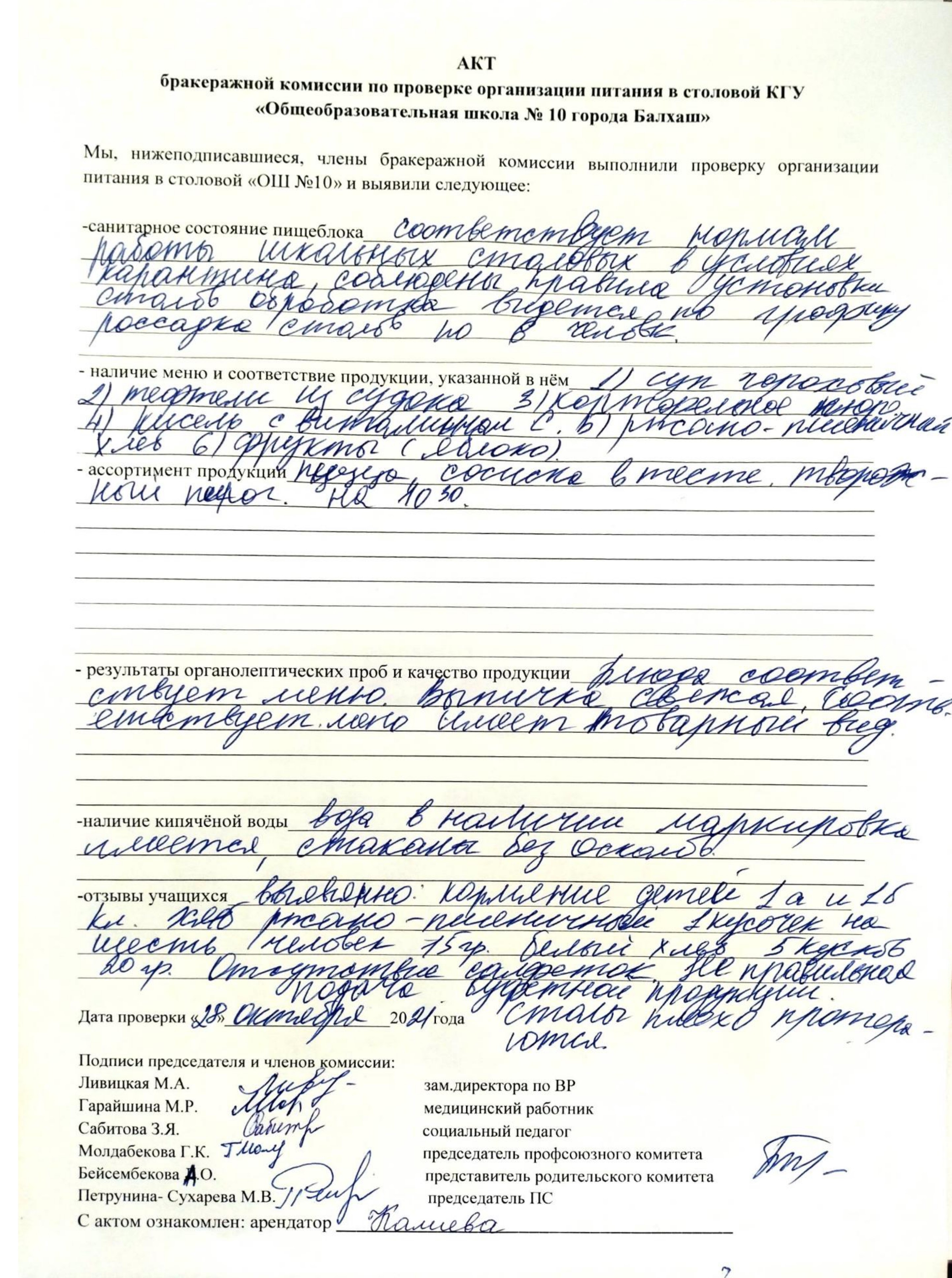 «Балқаш қаласының №10 жалпы білім беретін мектебі» КММ асханасында тамақтануды ұйымдастыруды тексеру жөніндегі бракераж комиссиясының актісі 28 қазан 2021 жыл