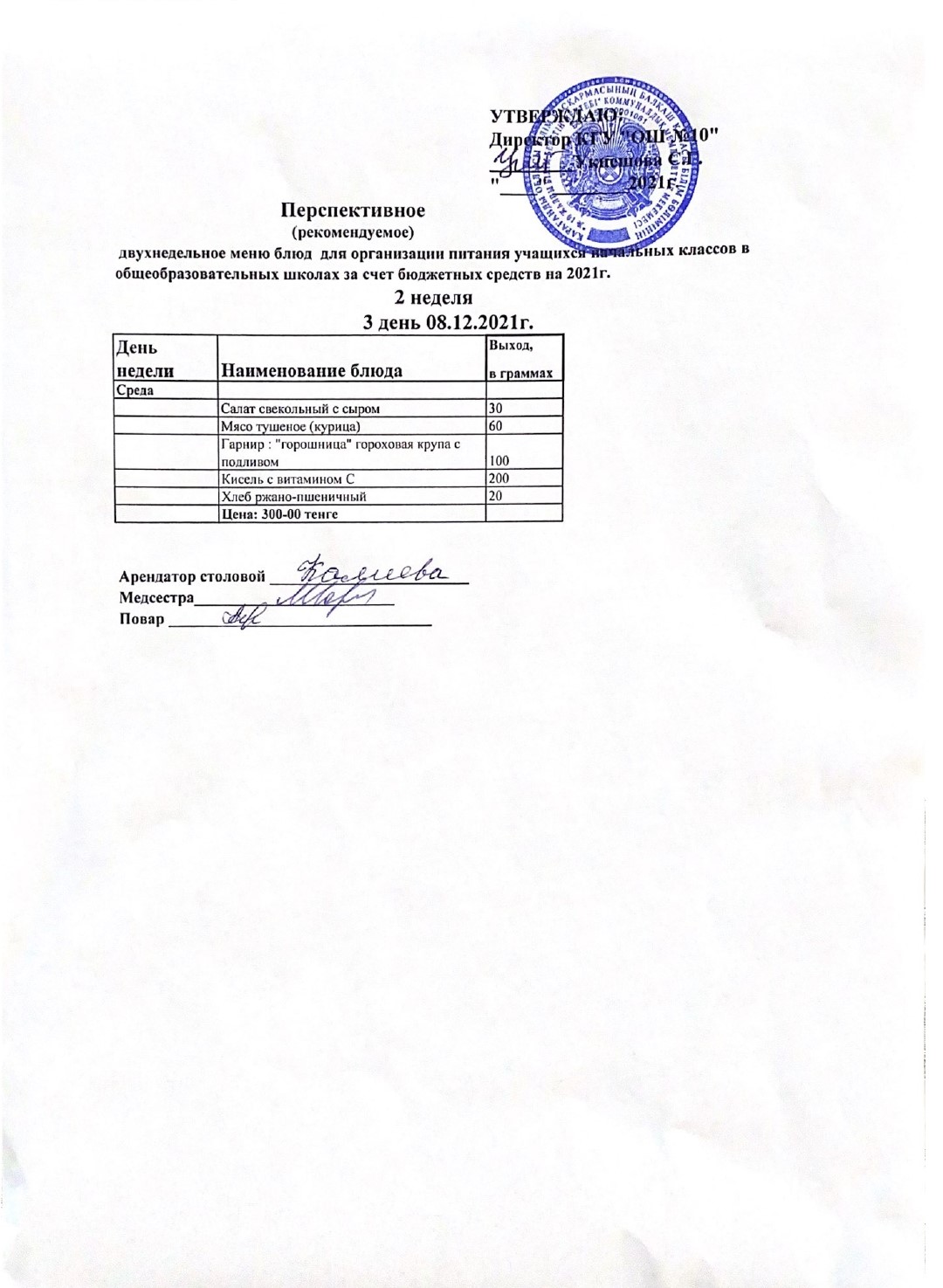 Перспективное (рекомендуемое) двухнедельное меню блюд для организации питания учащихся из социально-уязвимых слоев населения в общеобразовательных школах за счет бюджетных средств на 2021 год 2 неделя с 06.12.2021 по 10.12.2021 (3 день)