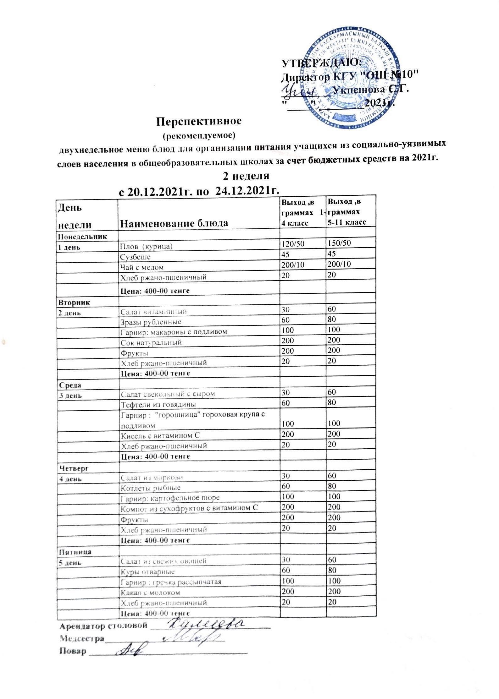 2021 жылға арналған бюджет қаражаты есебінен жалпы білім беретін мектептерде халықтың әлеуметтік осал топтарынан шыққан оқушыларды тамақтандыруды ұйымдастыру үшін перспективалы (ұсынылатын) екі апталық ас мәзірі 2 апта 20.12.2021-24.12.2021 (5 күн)