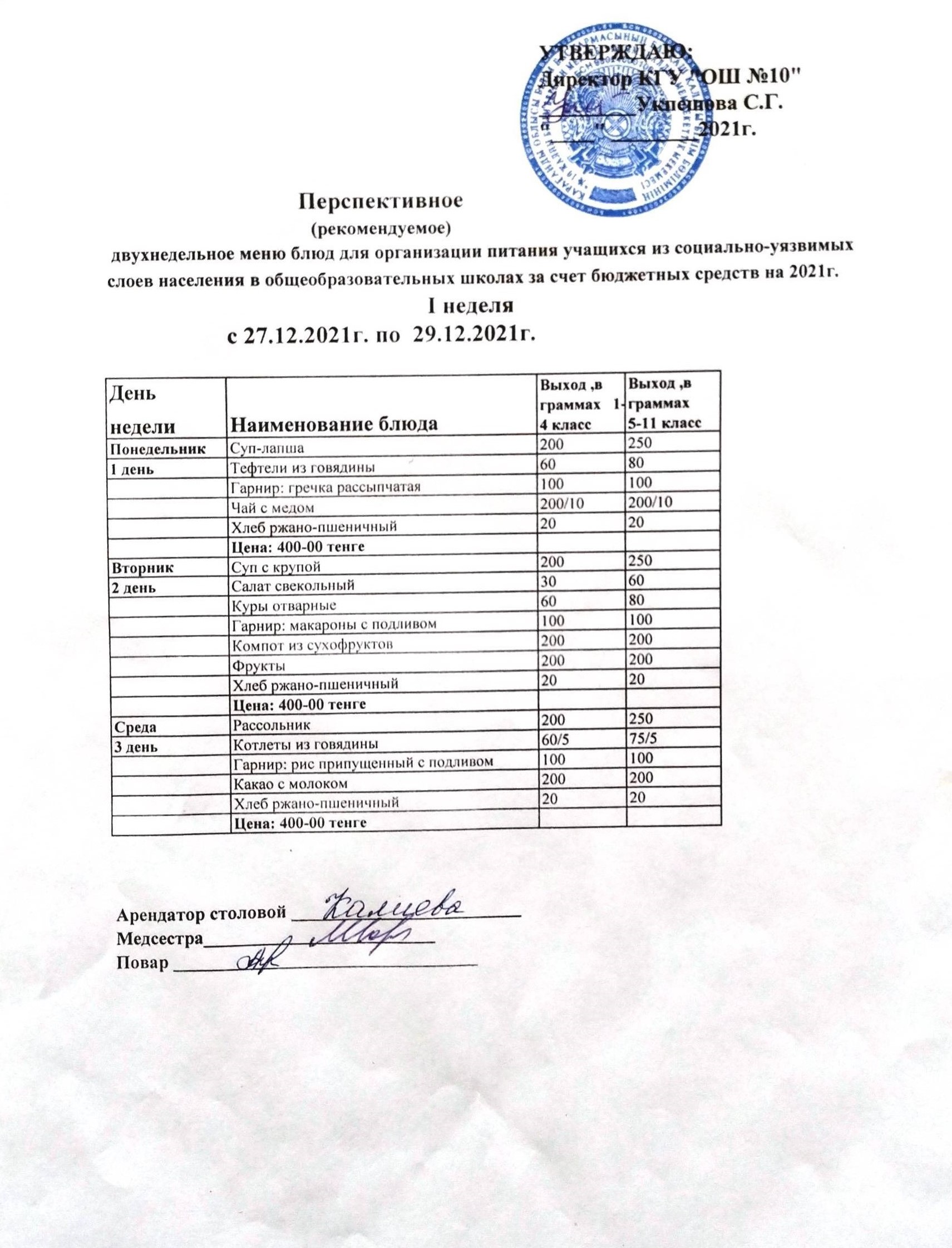 2021 жылға арналған бюджет қаражаты есебінен жалпы білім беретін мектептерде халықтың әлеуметтік осал топтарынан шыққан оқушыларды тамақтандыруды ұйымдастыру үшін перспективалы (ұсынылатын) екі апталық ас мәзірі 27.12.2021-29.12.2021 (1 күн)