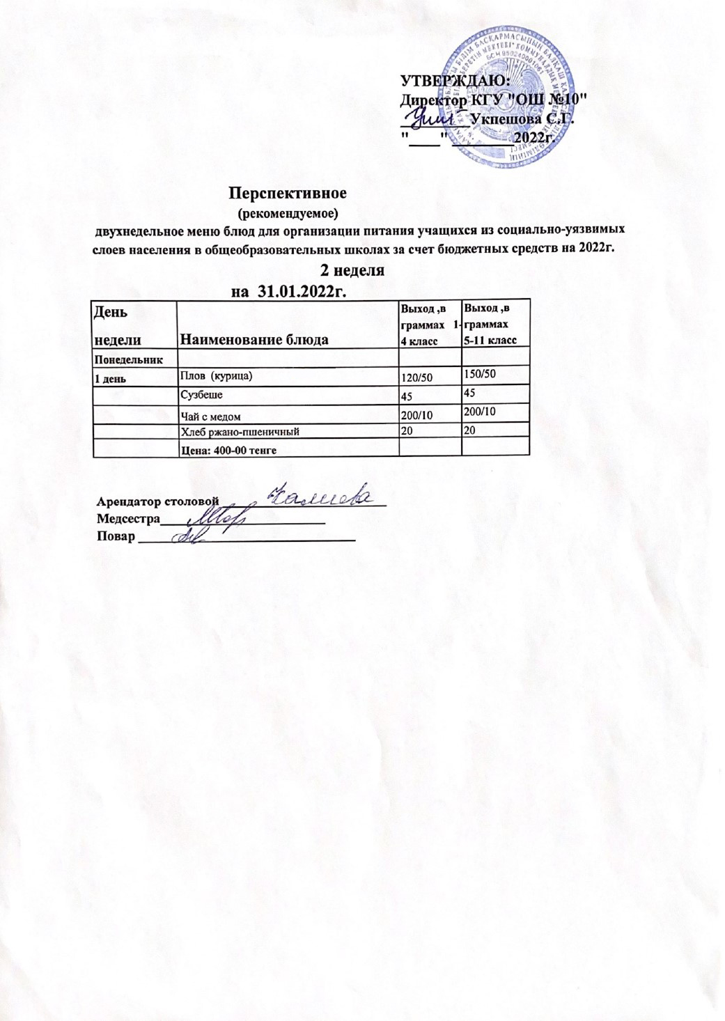 Перспективное (рекомендуемое) двухнедельное меню блюд для организации питания учащихся из социально-уязвимых слоев населения в общеобразовательных школах за счет бюджетных средств на 2022 год 2 неделя на 31.01.2022
