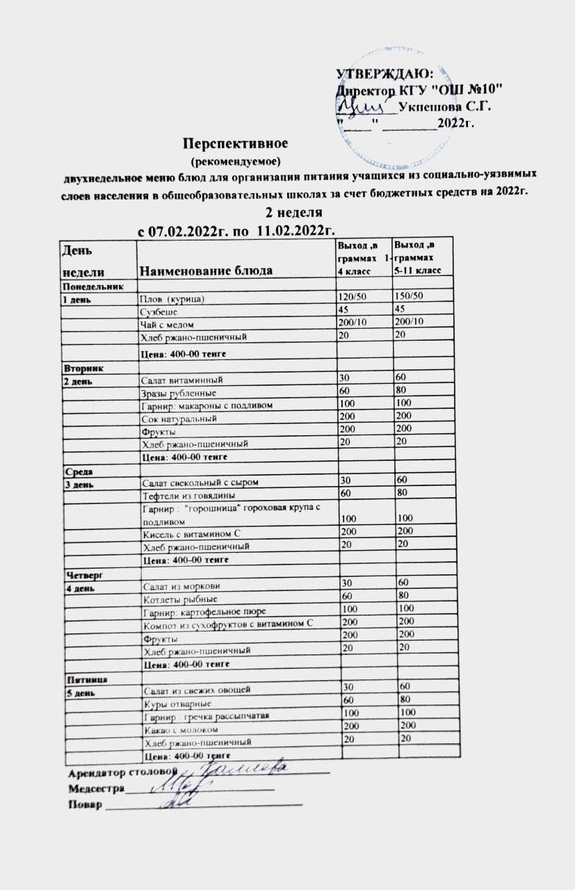 2022 жылға арналған бюджет қаражаты есебінен жалпы білім беретін мектептерде халықтың әлеуметтік осал топтарынан шыққан оқушыларды тамақтандыруды ұйымдастыру үшін перспективалы (ұсынылатын) екі апталық ас мәзірі 7.02.2022-ден 11.02.2022-ге дейін 2 апта (1