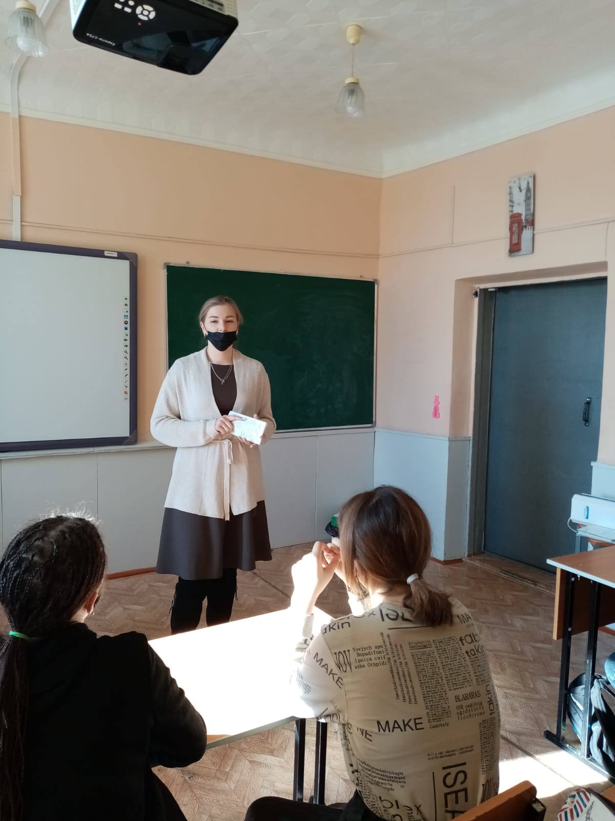 16.02 проведена встреча учащихся 9 кл. с выпускницей нашей школы Фроловой (Кирюшкиной) Анастасией, которая получила высшее медицинское образования, закончив КарМА. В настоящее время она преподает основы медицины для будущих медработников в Балхашском медицинском колледже. Анастасия рассказала ребятам о том, каким должен быть человек, который связал свою судьбу с профессией медработника, о правилах поступления в учебное заведение, о студенческой жизни. В конце встречи, учащиеся задали вопросы.