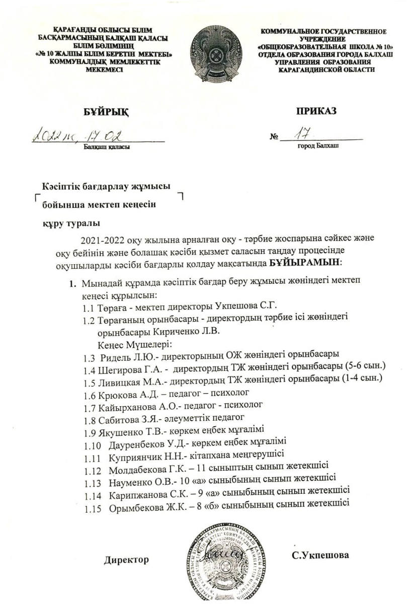 Кәсіптік бағдарлау жұмысы бойынша мектеп кеңесін құру туралы