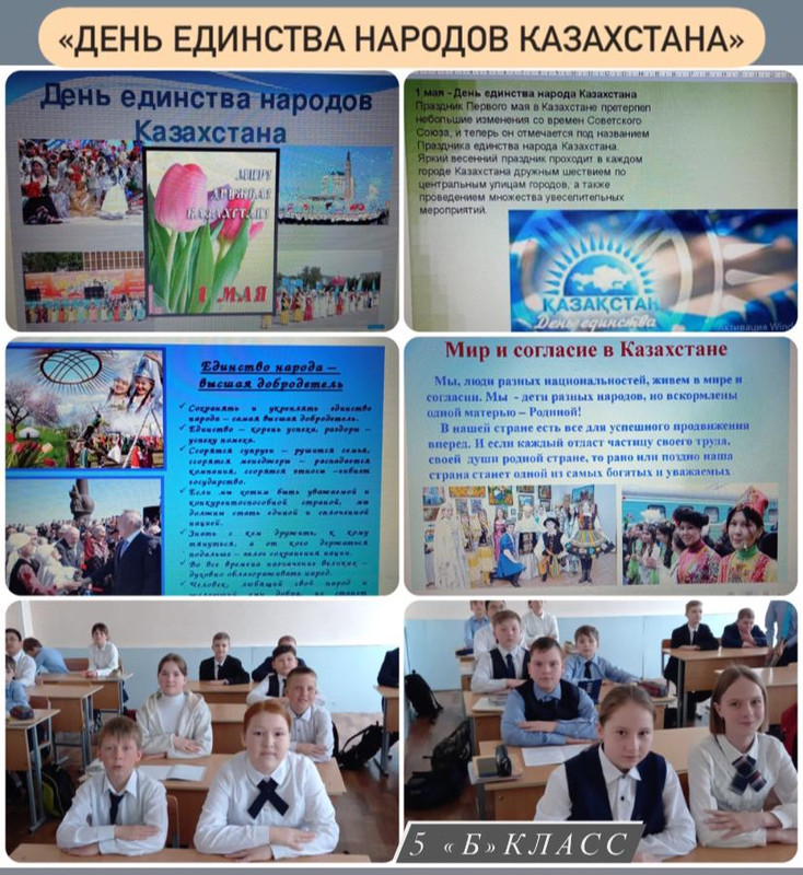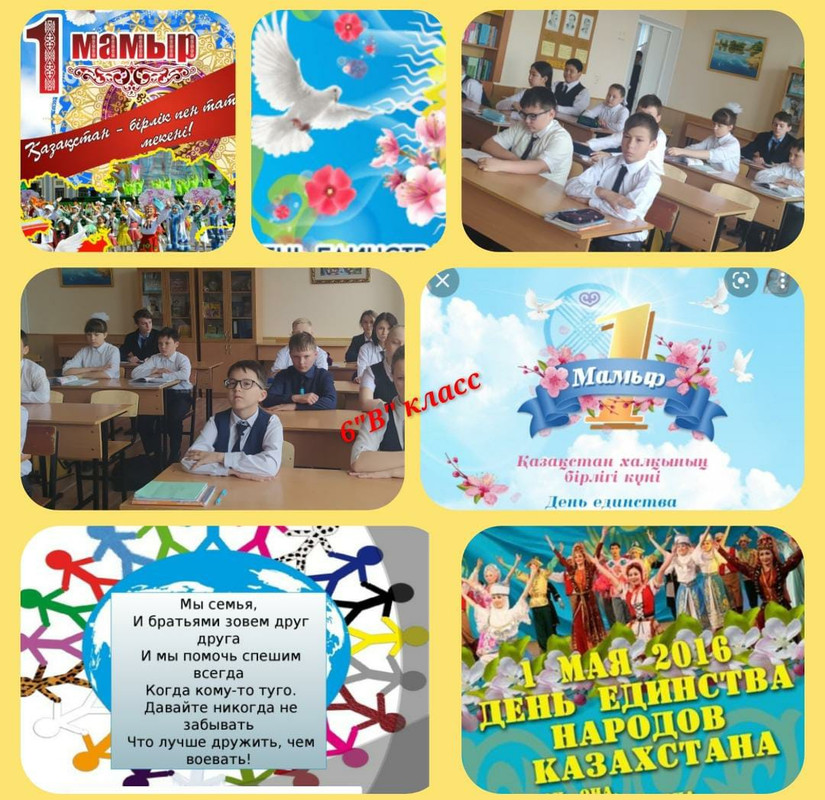 Впервые праздик 1- мая - День единство народов Казахстана отмечается в новом формате с 1996 года. Важно, чтобы разные народы в границах казахстанского государства жили мирно, понимали и уважали культуру, традиции, обычаи друг друга. Поэтому целью классных часов среди учеников 5-6 классов сталасформировать между детьми дружеские взаимоотношения; научить детей помогать друг другу, уважать и ценить
