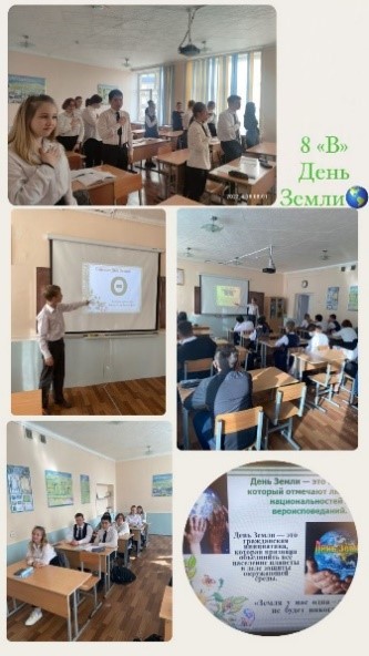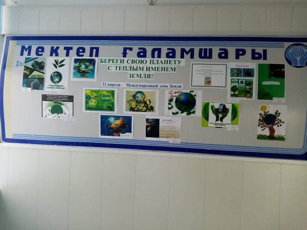 Был оформлен информационный стенд «Береги свою планету с теплым именем Земля!» с конкурсными работами – флаерами «Нам завещано беречь этот мир!». Учащиеся 10 «б» Хван Галина,10 «а» Ахметова Мадина, 9 «а» Галиев Еркебулан,8 «б» Бабкина Ангелина, Евстафьева Анастасия, 7 «а» Силюева Ангелина, учащиеся 8 «в» класса представили на конкурс интересные работы, которые призывают жителей планеты беречь ее. Все учащиеся награждены грамотами.