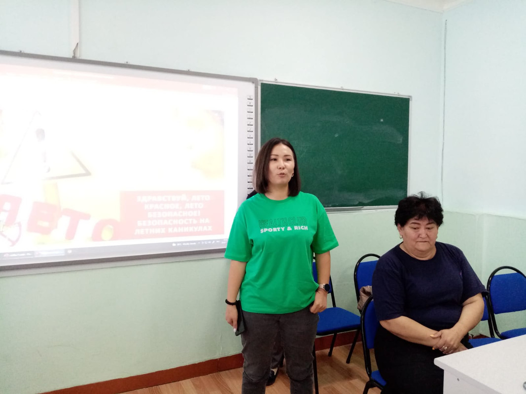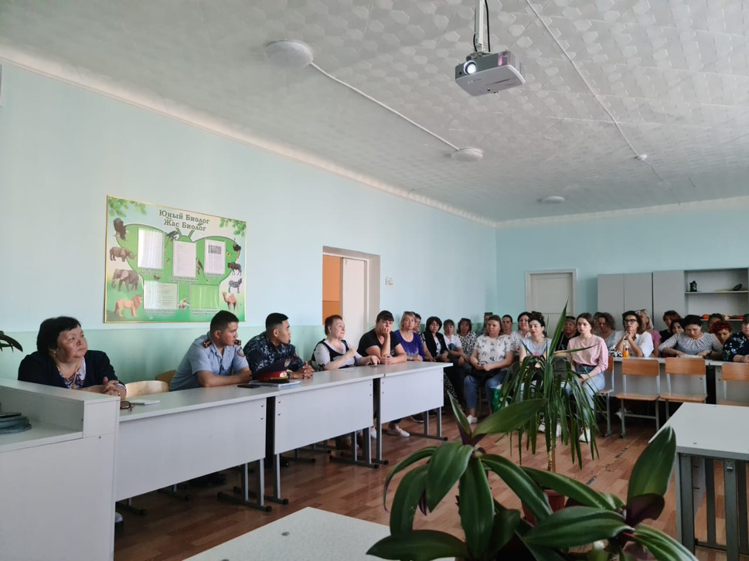 Лето – пора каникул, жаркое время года. Большую часть своего времени дети проводят на озере. Спасатель ВСС Абжанова Б.С. привела примеры беспечного отношения родителей к нахождению детей без присмотра взрослых на озере, которое приводит к гибели детей.Рассказала о правилах пребывания взрослых и детей на солнце. Тренинг «Тропинка родительской любви» провели психологи школы Кайырханова А.О. и Крюкова А.Д..