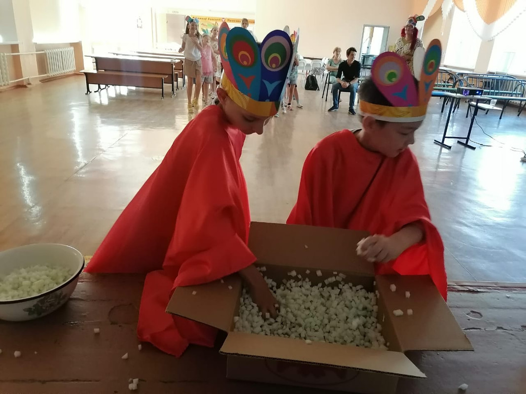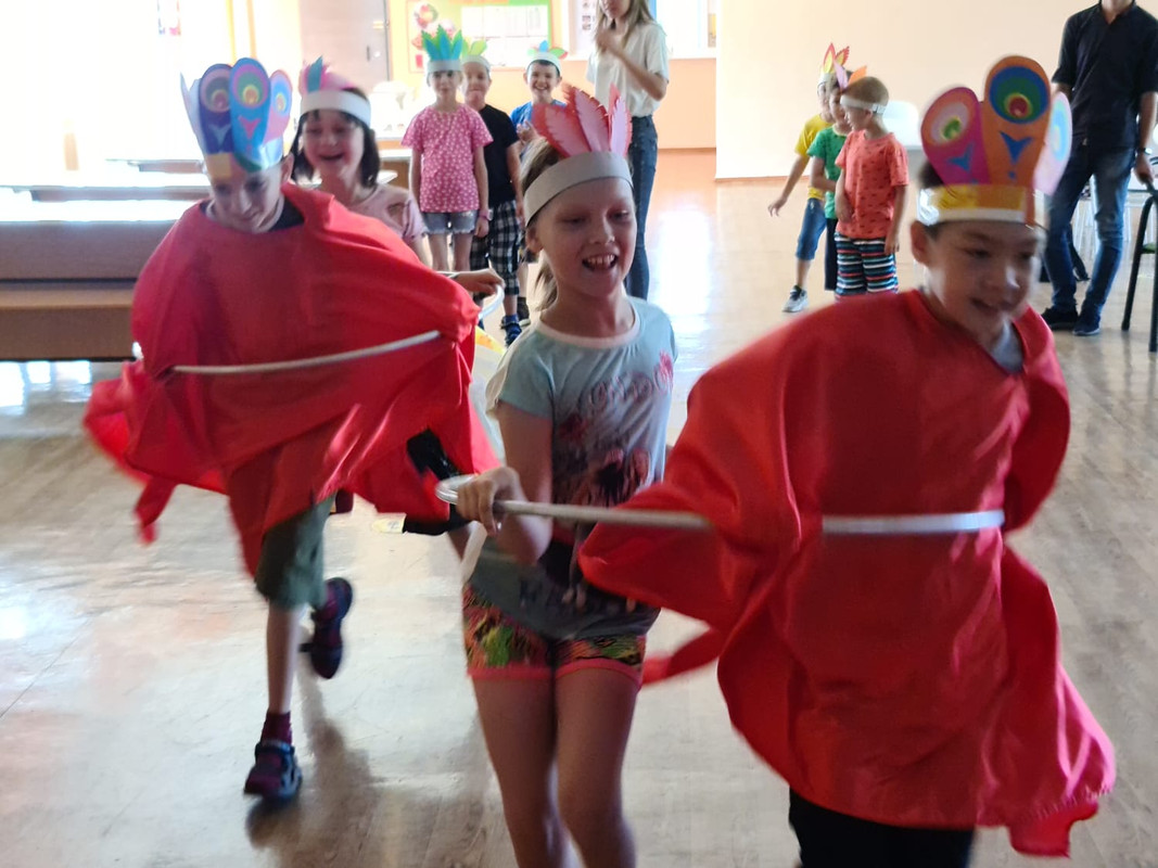 17 июня Солнечный город вновь огласился победным кличем. Индейцы. Вождь ЗоркийВзгляд Четыре Глаза приветствовал ребят по дороге на завтрак. После приема пищи, ребята разделились на 2 племени: Дети Солнца и Дети Луны. Вожди, их Скво и племена сражались за Мир. Начало сражений было в актовом зале большого вигвама, а продолжилось всё на улице. По широким и залитым Солнцем нашего города улочкам шли племена и выполняли задания. Топор войны был закрыт, а сладкий приз был найден и съеден на полдник.
