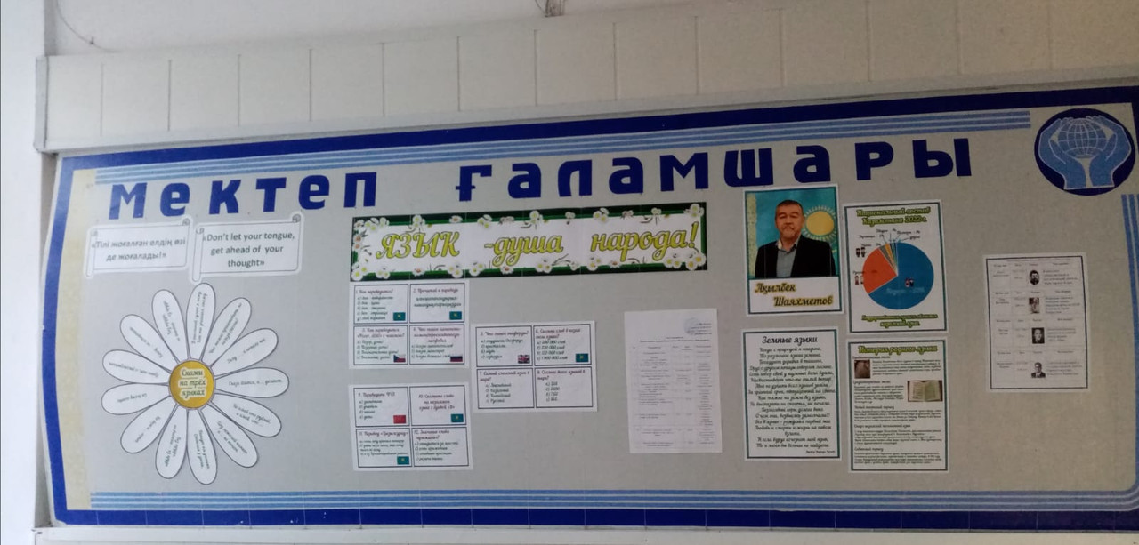 На информационном стенде оформлен материал «Язык – душа народа» с интересными фактами из истории развития казахского языка. Учащимся предложено принять участие в викторине и в интеллектуальной разминке «Скажи на 3-х языках». Самые активные участники при подведении итогов Недели будут отмечены специальным поощрительным призом.