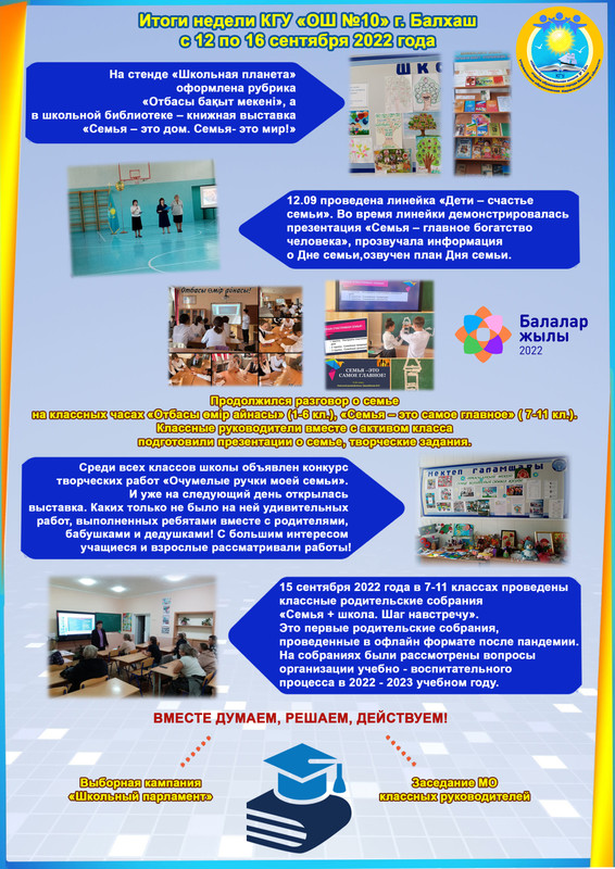 Сіздердің назарларыңызға Балқаш қаласының "№10 ЖББМ" КММ-нің 12-16 қыркүйек аптасындағы жұмыс қорытындыларын ұсынамыз.