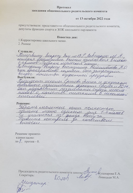 2022 жылғы 13 қазандағы мектеп ата-аналар комитеті отырысының хаттамасы