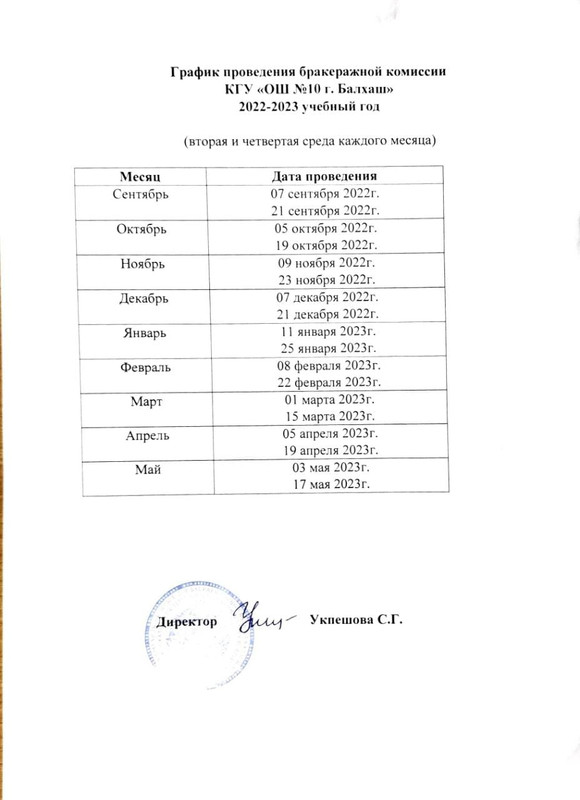 График проведения бракеражной комиссии КГУ "ОШ №10 г.Балхаш" 2022-2023 учебный год