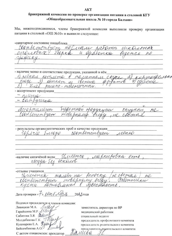 «Балқаш қаласының №10 жалпы білім беретін мектебі» КММ асханасында тамақтануды ұйымдастыруды тексеру жөніндегі бракераж комиссиясының актісі 7 қыркүйек 2022 жыл