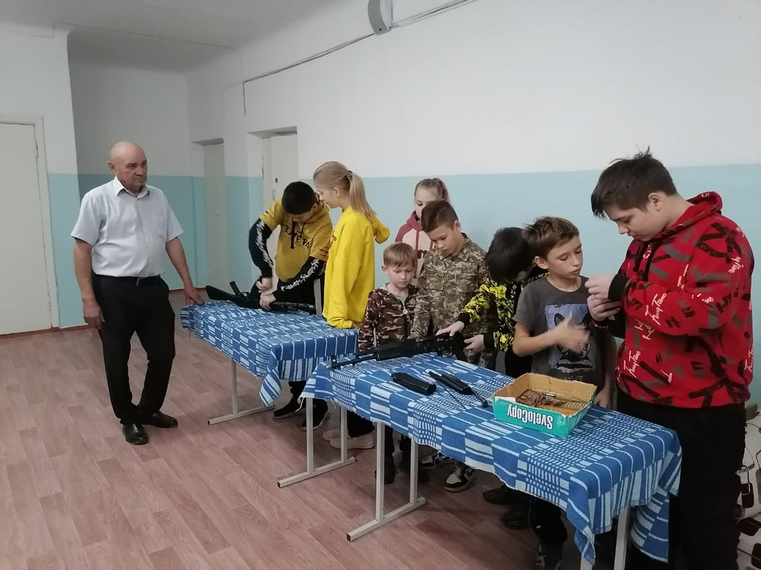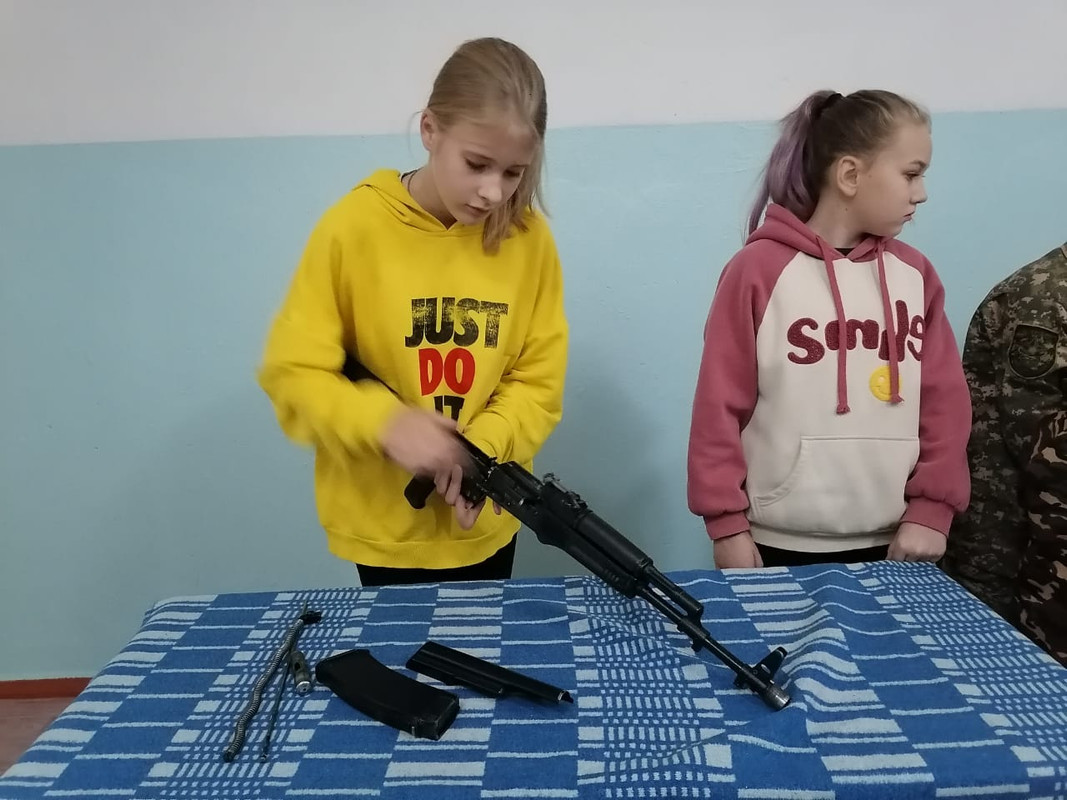 Дети учились разбирать и собирать автоматы, пенал. У ребят получалось все четко и быстро. Участница Гончар Ксения 8 класса училась стрелять из автомата. Самая активная оказалась Гладких София из 6А класса.