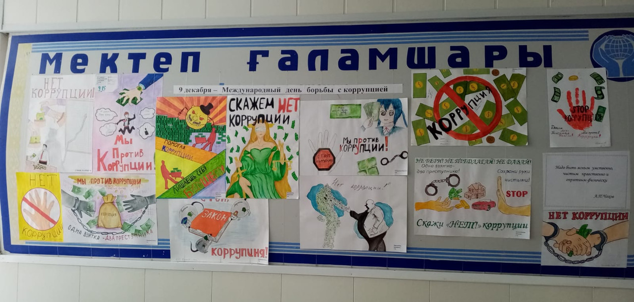 Халықаралық сыбайлас жемқорлыққа қарсы күрес күніне арналған жұмыс жоспарына сәйкес мектепте «Тоқта– сыбайлас жемқорлық!»оған 7-9 сынып суретшілері қатысты. Плакаттар жарқын, мазмұнды, ұқыпты орындалды! Байқаудың барлық қатысушылары грамоталармен марапатталды! 5,6 сынып оқушылары сыбайлас жемқорлыққа қарсы күреске қатысудан тыс қалмады: балалар «Сыбайлас жемқорлық балалардың көзімен!» тақырып бойынша балалар осы зұлымдыққа қарсы наразылықтарын суреттер арқылы білдірді. «Біз бірге-сыбайлас жемқорлыққа қарсы!»плакаттар мен суреттер көрмеде ұсынылды. Мектеп парламентінің өкілдері әлеуметтік педагогпен бірге мектеп педагогтары, қызметкерлері мен оқушылары арасында «Сыбайлас жемқорлық және оған қарсы күрес шаралары» әлеуметтік сауалнама жүргізді. Сауалнама нәтижелері біздің мектепте сыбайлас жемқорлық көріністеріне орын жоқ екенін көрсетті: сыбайлас жемқорлық қылмыс екенін және онымен күресу керек екенін бәрі біледі!