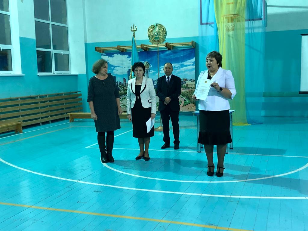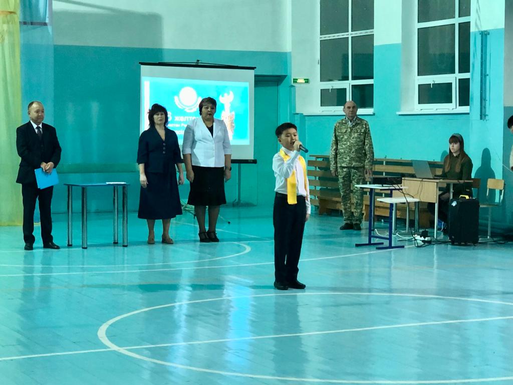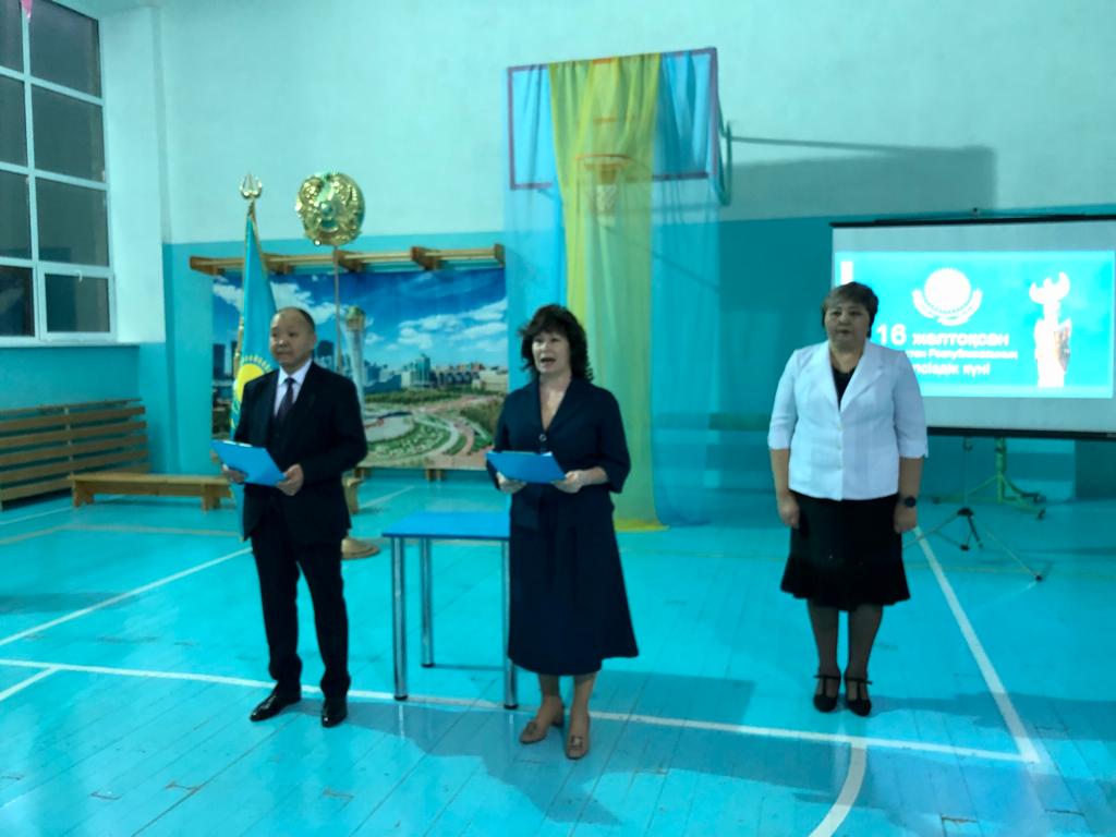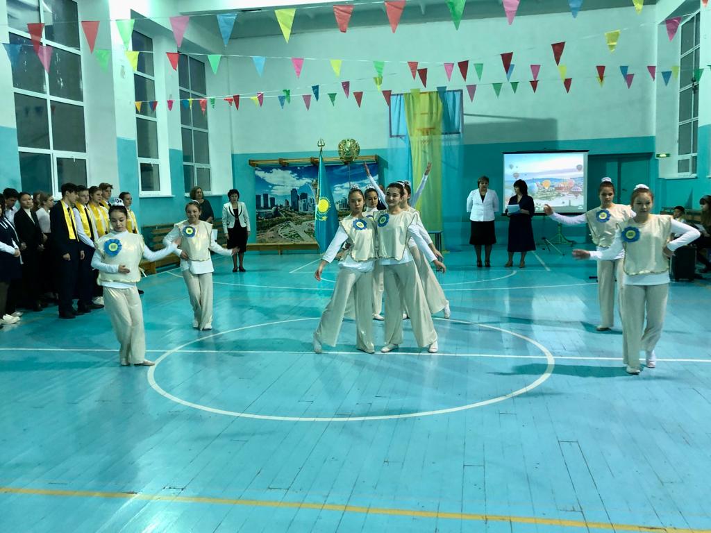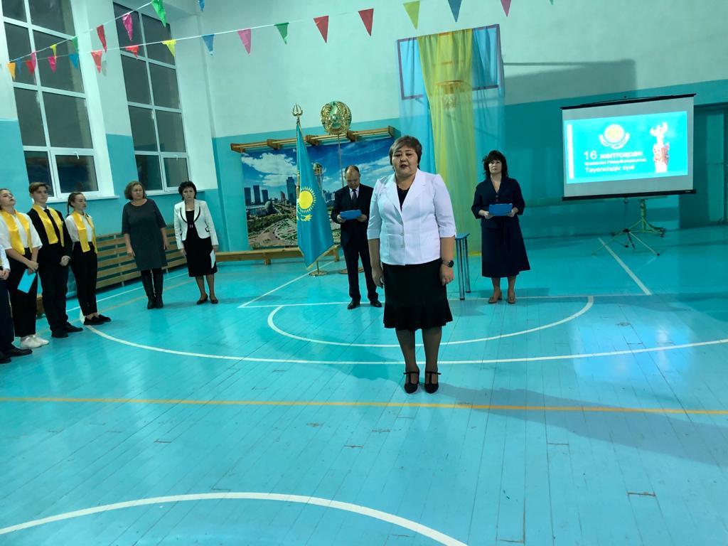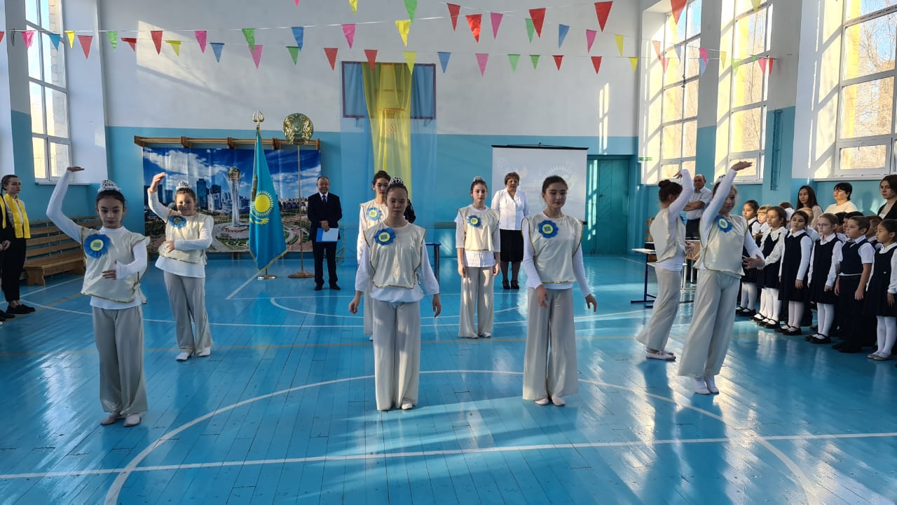 Жиынмерекелік безендірілген залда өткізілді. Мемлекеттік Ту мен Елтаңба орнатылып, Қазақстан Республикасының Мемлекеттік Әнұраны орындалды. Мектеп директоры құттықтау сөз сөйледі. Сауле Газисовнаел болашағы қолында тұрған жас ұрпақ үшін мерекенің маңыздылығын атап өтті.