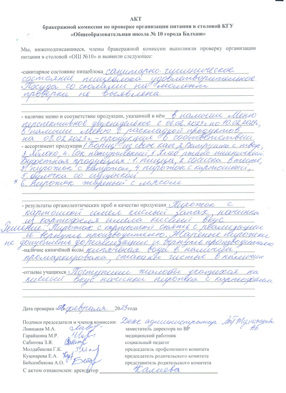 «Балқаш қаласының №10 жалпы білім беретін мектебі» КММ асханасында тамақтануды ұйымдастыруды тексеру жөніндегі бракераж комиссиясының актісі 8 ақпан 2023 жыл