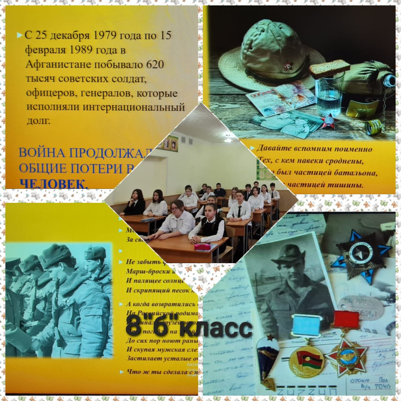 15 февраля – День вывода советских войск из Афганистана — это, и праздник афганцев-ветеранов, и день памяти и скорби обо всех погибших воинах-интернационалистах. Ежегодно в школе проводятся мероприятия, посвященные этому событию. В плане различные мероприятия: Уроки мужества, встреча с воинами – афганцами, акция «Красный тюльпан», выставки.