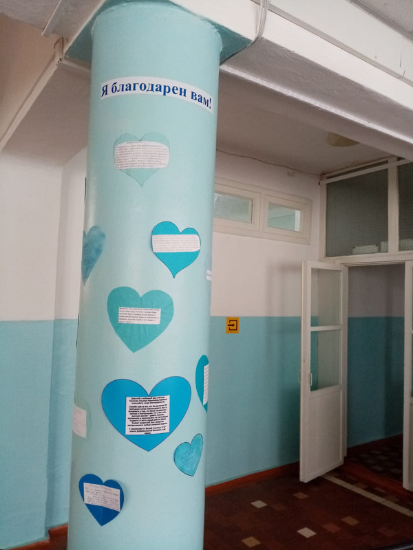 Көк жүректерге балалар алғыс сөздерін жазды. «Мен сізға рахмет айтамын» атты жүректері бар колонна ресімделді. 9-11 сынып оқушылары «Мейірімді сөздер сыйла!»алғыс сөздеріменмейірімділік эстафетасына қатысты.