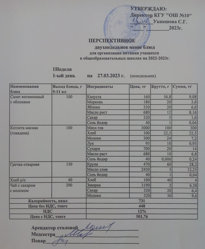 2022-2023 жылдарға арналған бюджет қаражаты есебінен жалпы білім беретін мектептердегі бастауыш сынып оқушыларын тамақтандыруды ұйымдастыру үшін перспективалы (ұсынылатын) екі апталық ас мәзірі 1 апта 27.03.2023 (дүйсенбі)